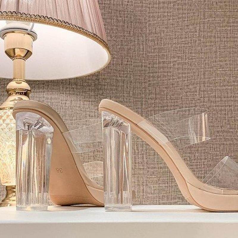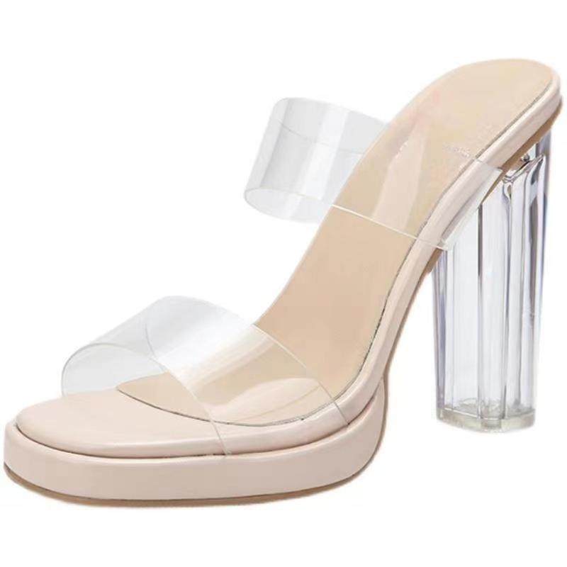 夏季凉鞋女高跟2024年透明新款粗跟防水台百搭一字带水晶跟凉拖鞋