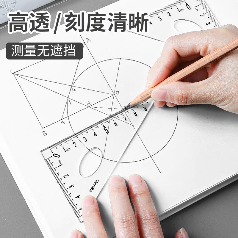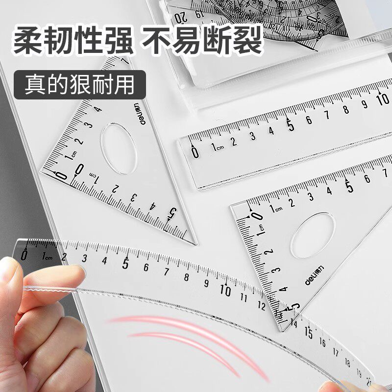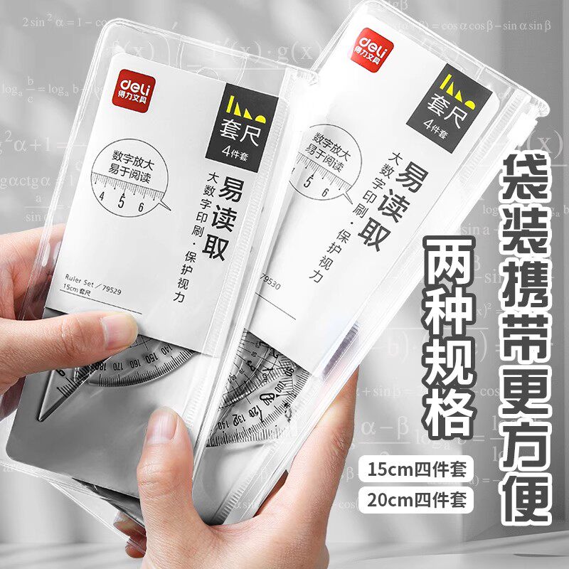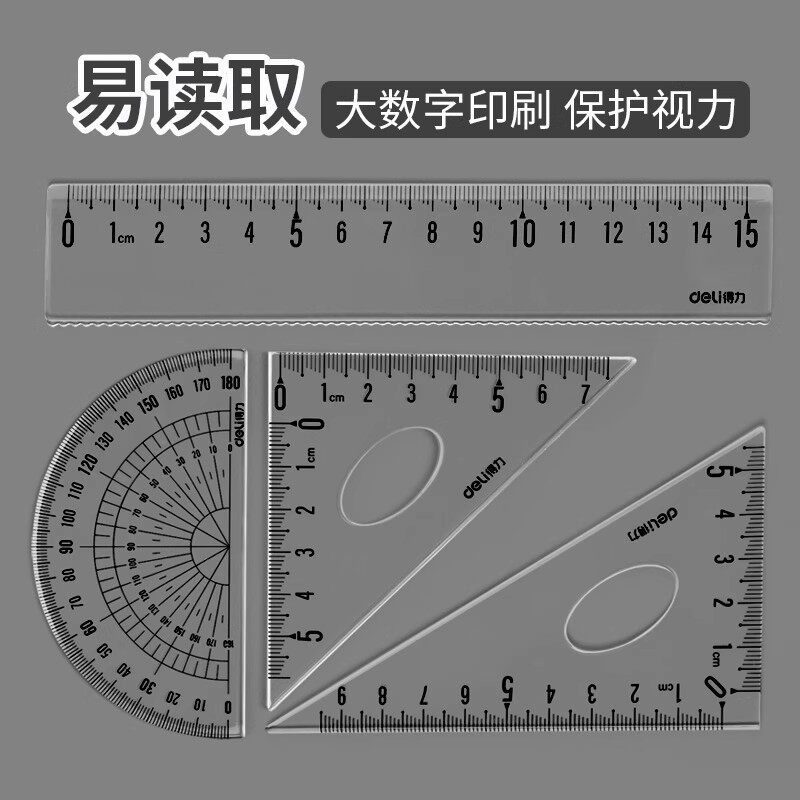 得力学生套尺四件套三角尺15cm20cm直尺量角器套装透明绘图直尺子