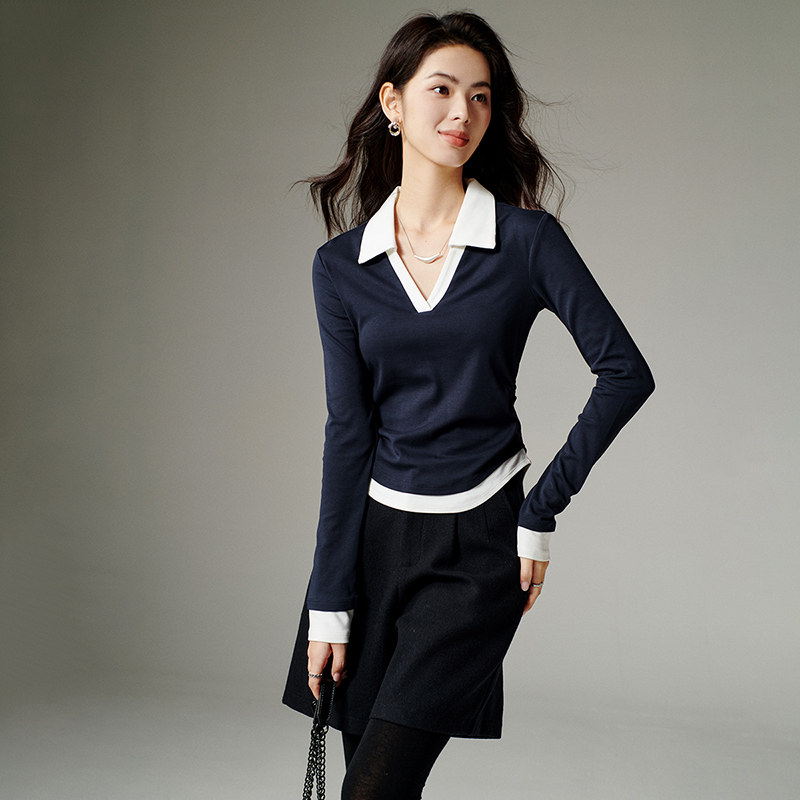 三福打底衫女2025新款秋季简约纯色收腰V领修身休闲长袖上衣女装