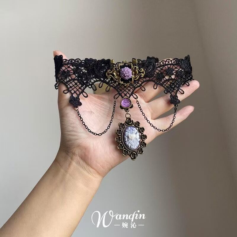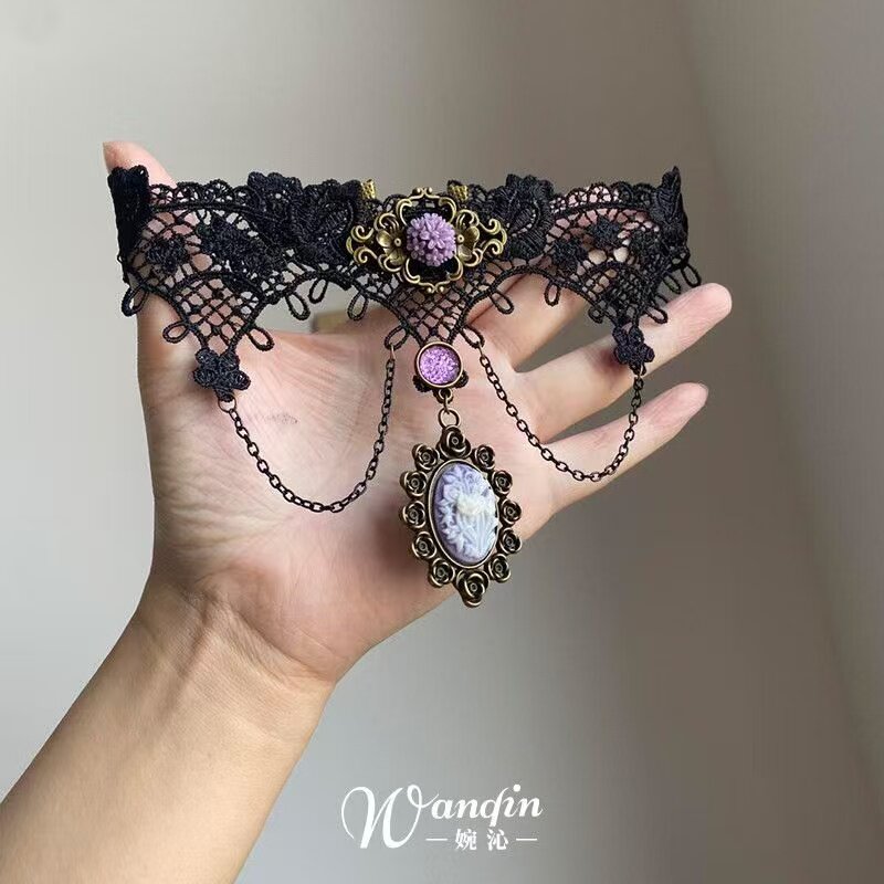 「曼陀罗」暗黑风黑色蕾丝紫色花朵项链哥特亚文化复古小众锁骨链