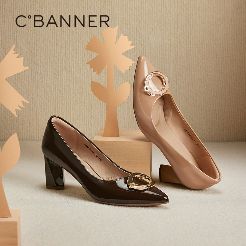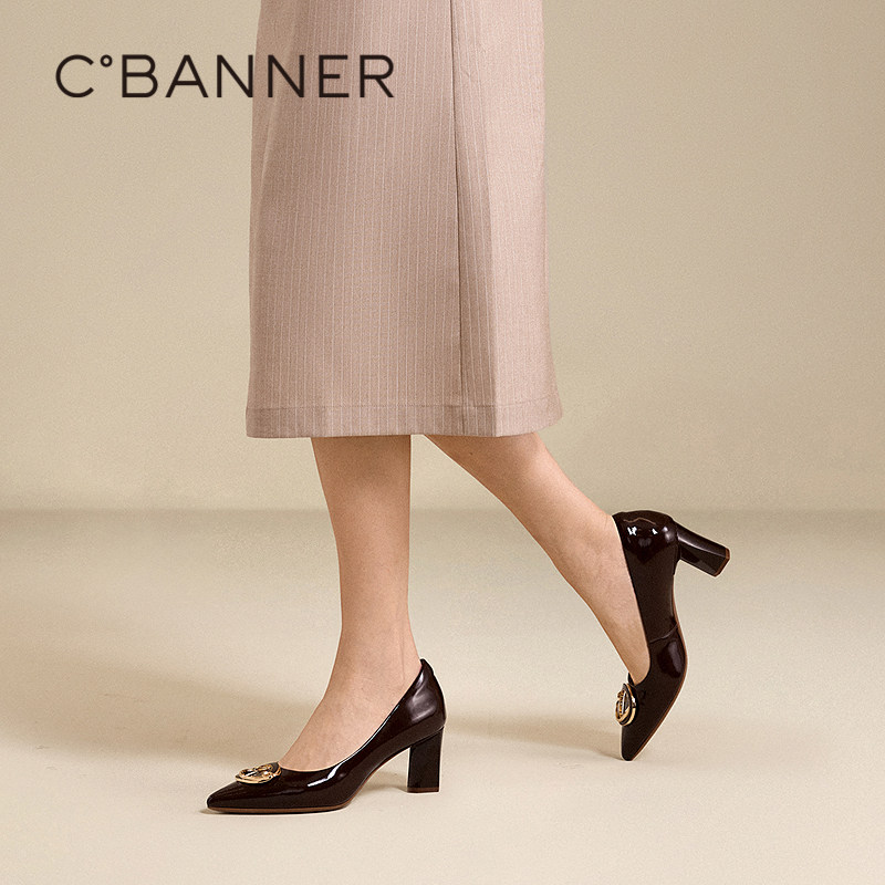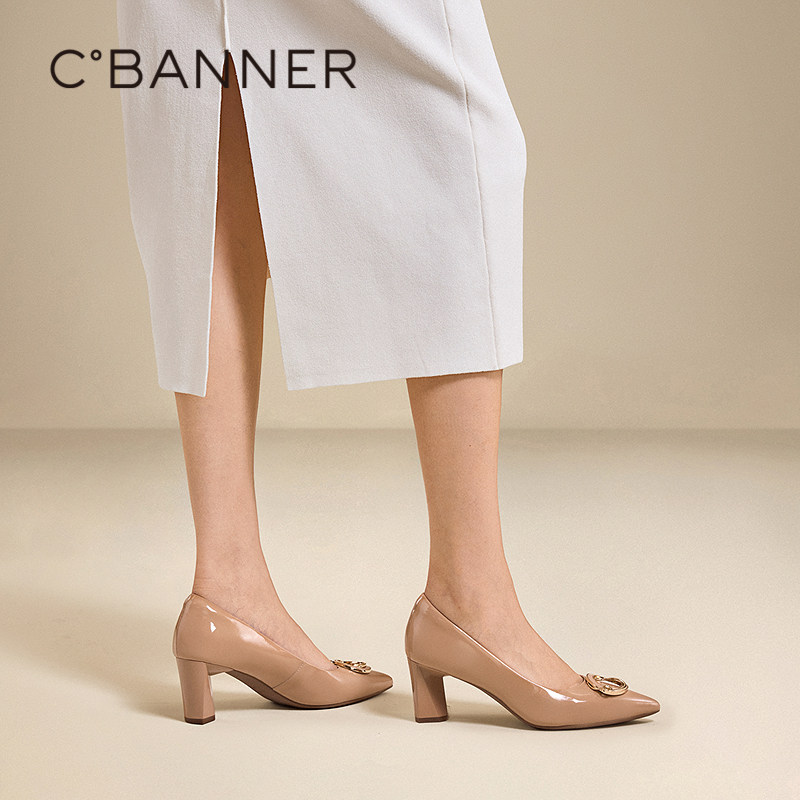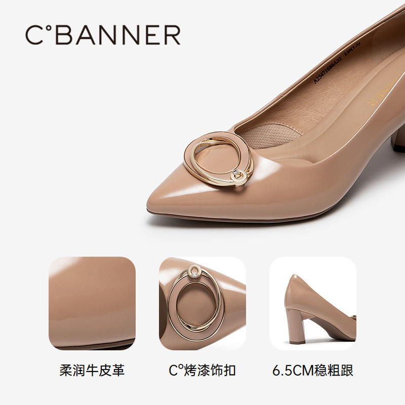 千百度尖头粗高跟鞋女2025秋季新款牛漆皮通勤法式气质浅口单鞋