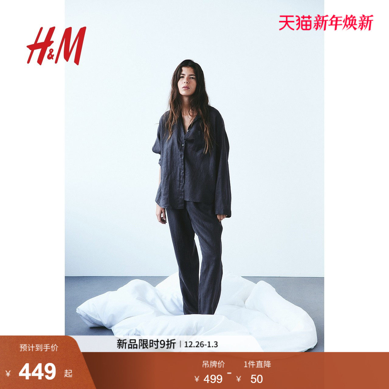 HM女士家居服睡衣冬季衬衫领长袖长裤亚麻睡衣0747936
