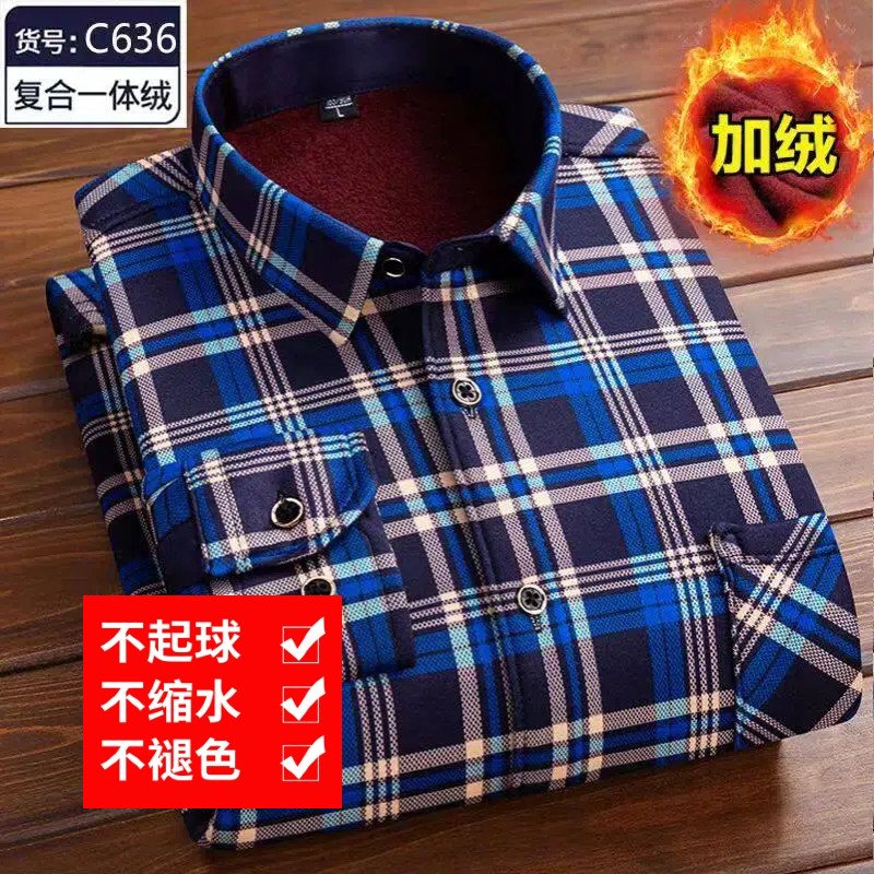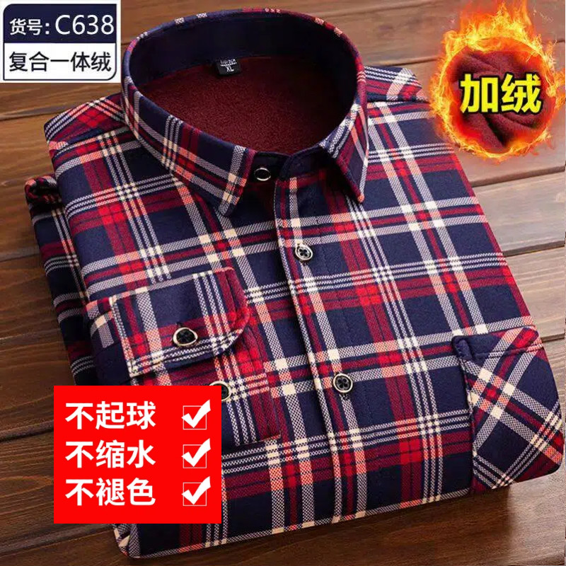 冬季男士加绒加厚保暖衬衫格子长袖中老年爸爸装宽松休闲大码衬衣