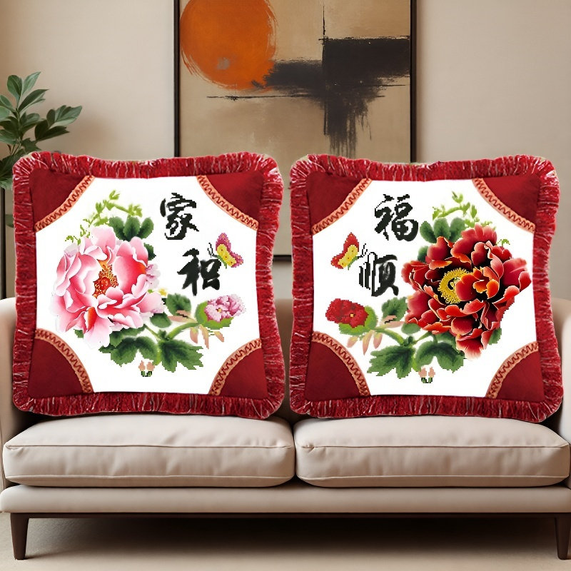 自己绣十字绣抱枕一对家和福顺中国风花草类客厅沙发汽车枕套45CM