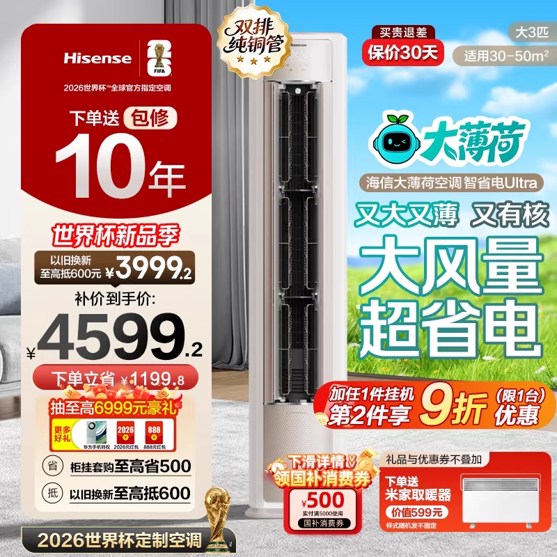 海信空调智新风X3Pro新风大3匹家用立式国补一级能效客厅柜式柜机