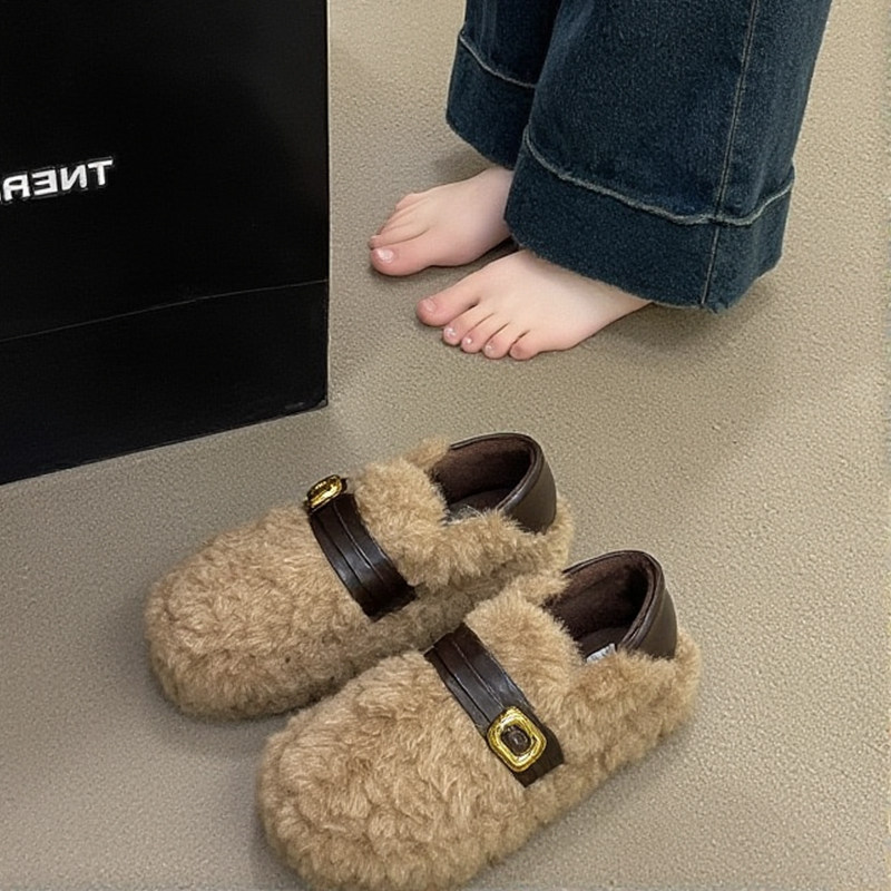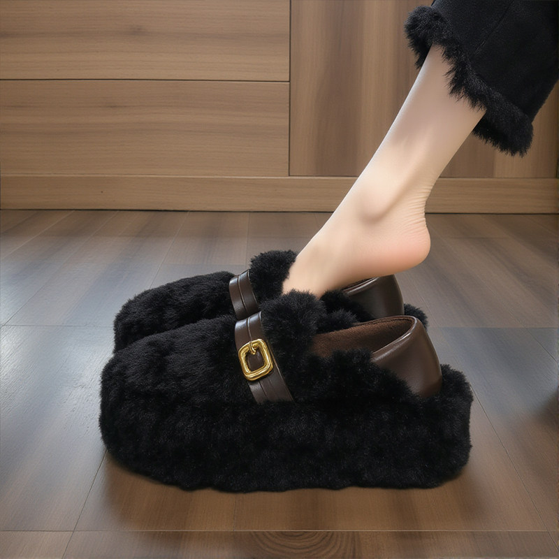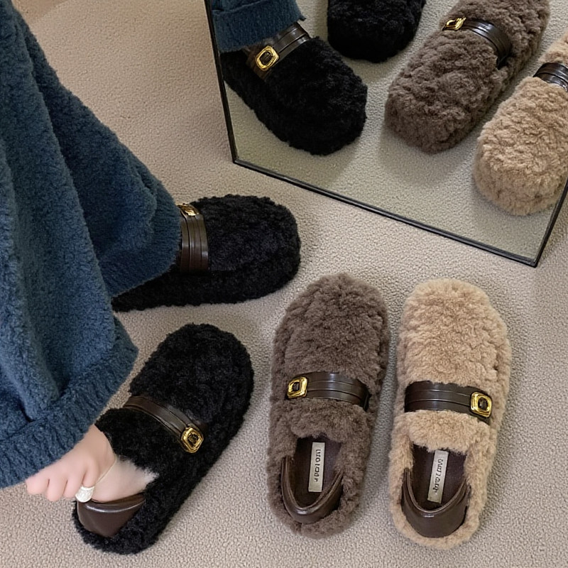 【羊羔绒】毛毛鞋女2025年新款冬季厚底皮带扣加绒保暖一脚蹬棉鞋