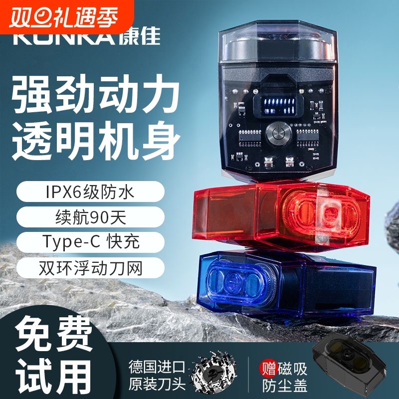 康佳剃须刀双引擎透明机甲双头剃须刀男士大容量迷你充电刮胡刀