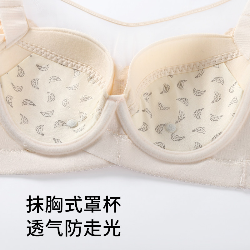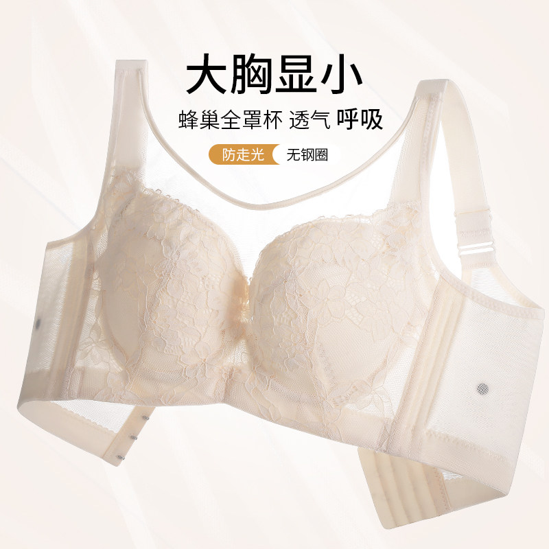润微茶肌内衣女士大胸显小薄款收副乳聚拢大码上托防下垂蕾丝文胸