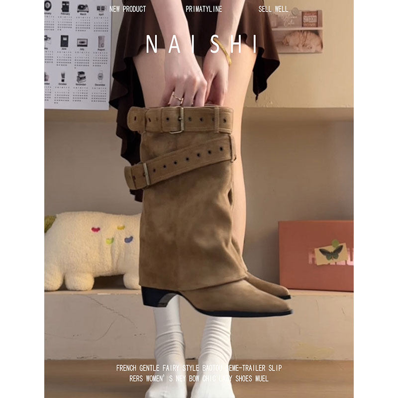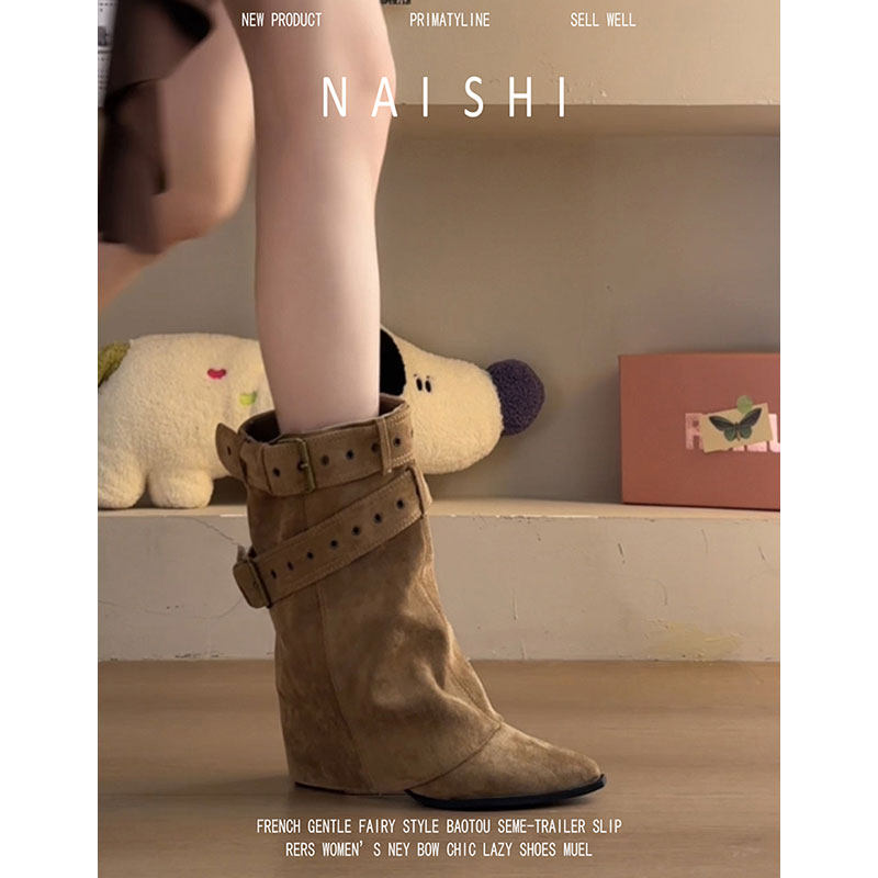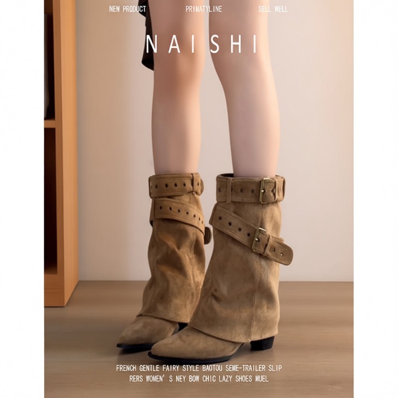 羊皮版~内增高靴子女2025新款爆款中筒粗跟短靴卡其色褶皱堆堆靴