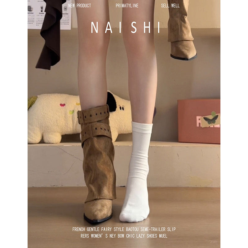 ~美拉德裤管靴女2025秋显瘦增高中筒短靴尖头黑色羊皮棕色精品