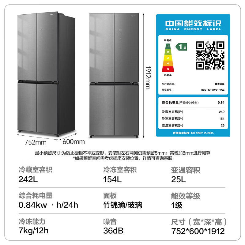 容声421WVS1FPCZ十字四门60cm平嵌养鲜玻璃面板一级变频家用冰箱
