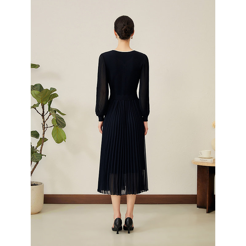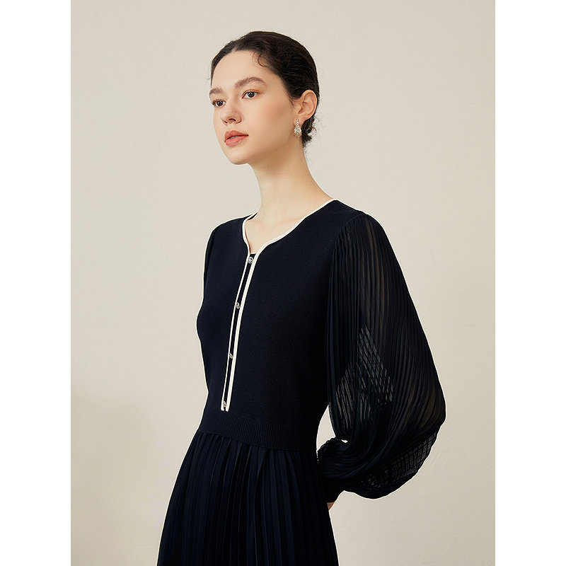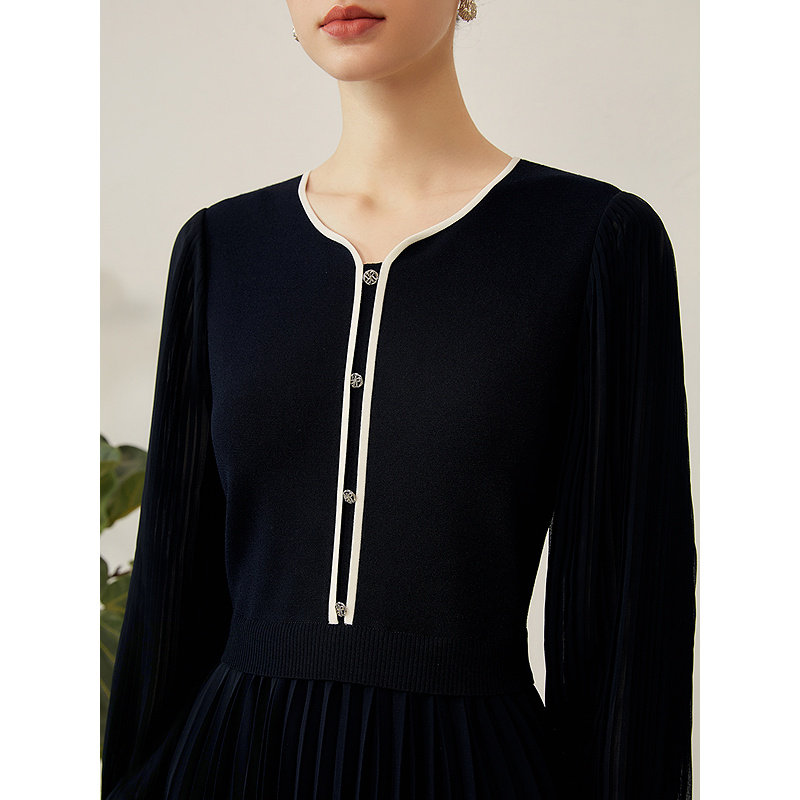 YINER音儿2025秋季新款法式优雅针织拼接雪纺百褶假两件连衣裙