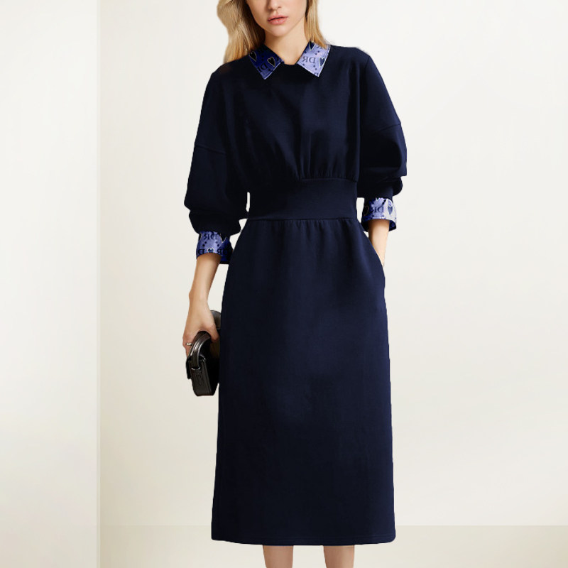 一三良品小个子 南法假日 复古显瘦深蓝波点蕾丝拼接连衣裙长裙