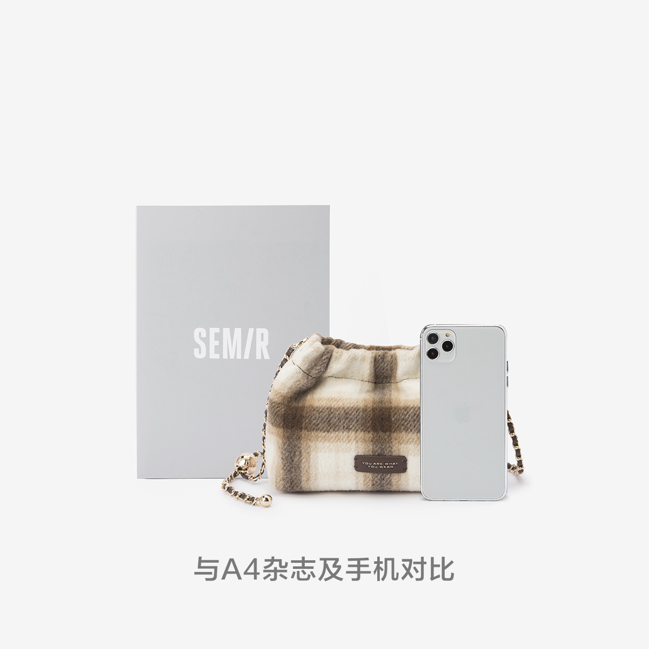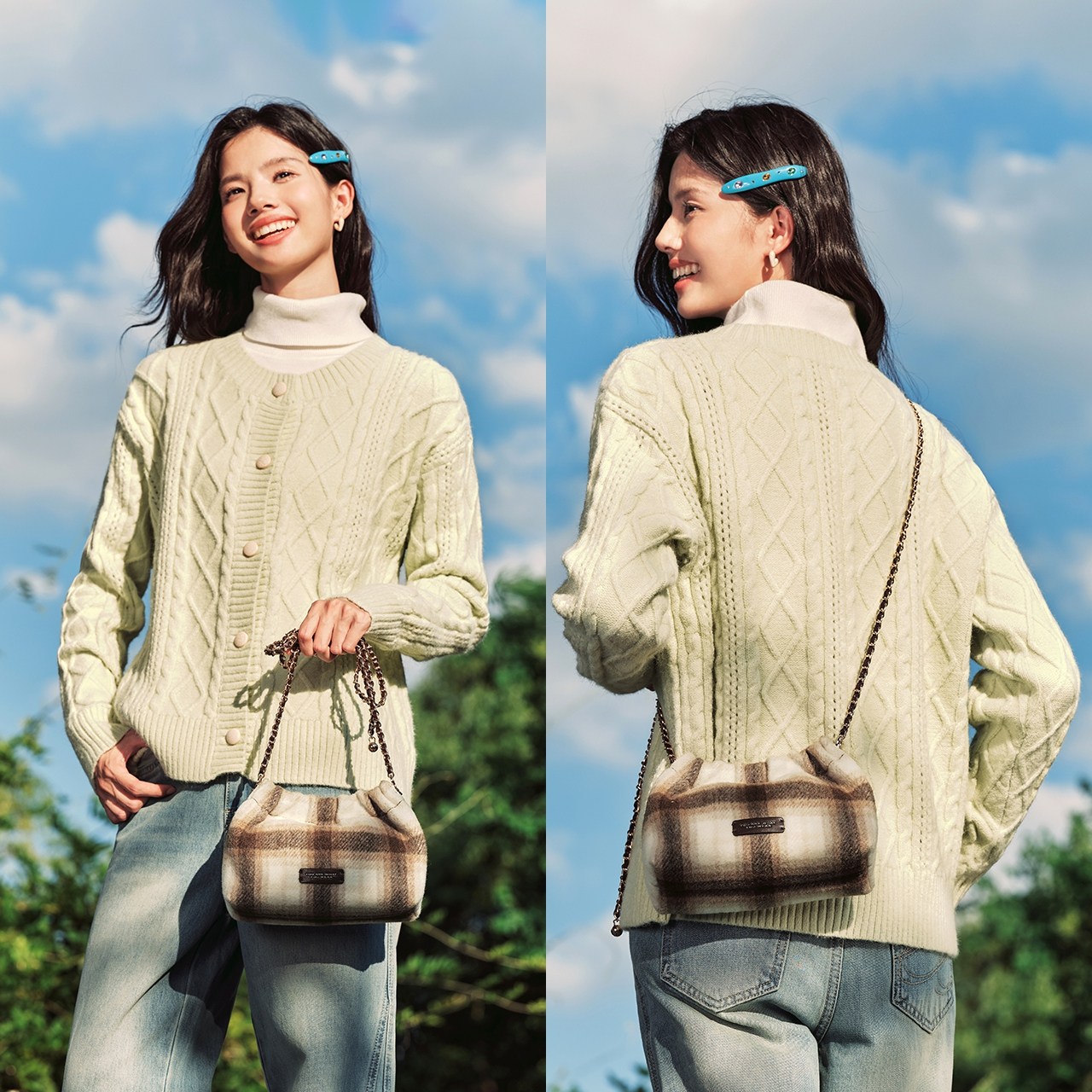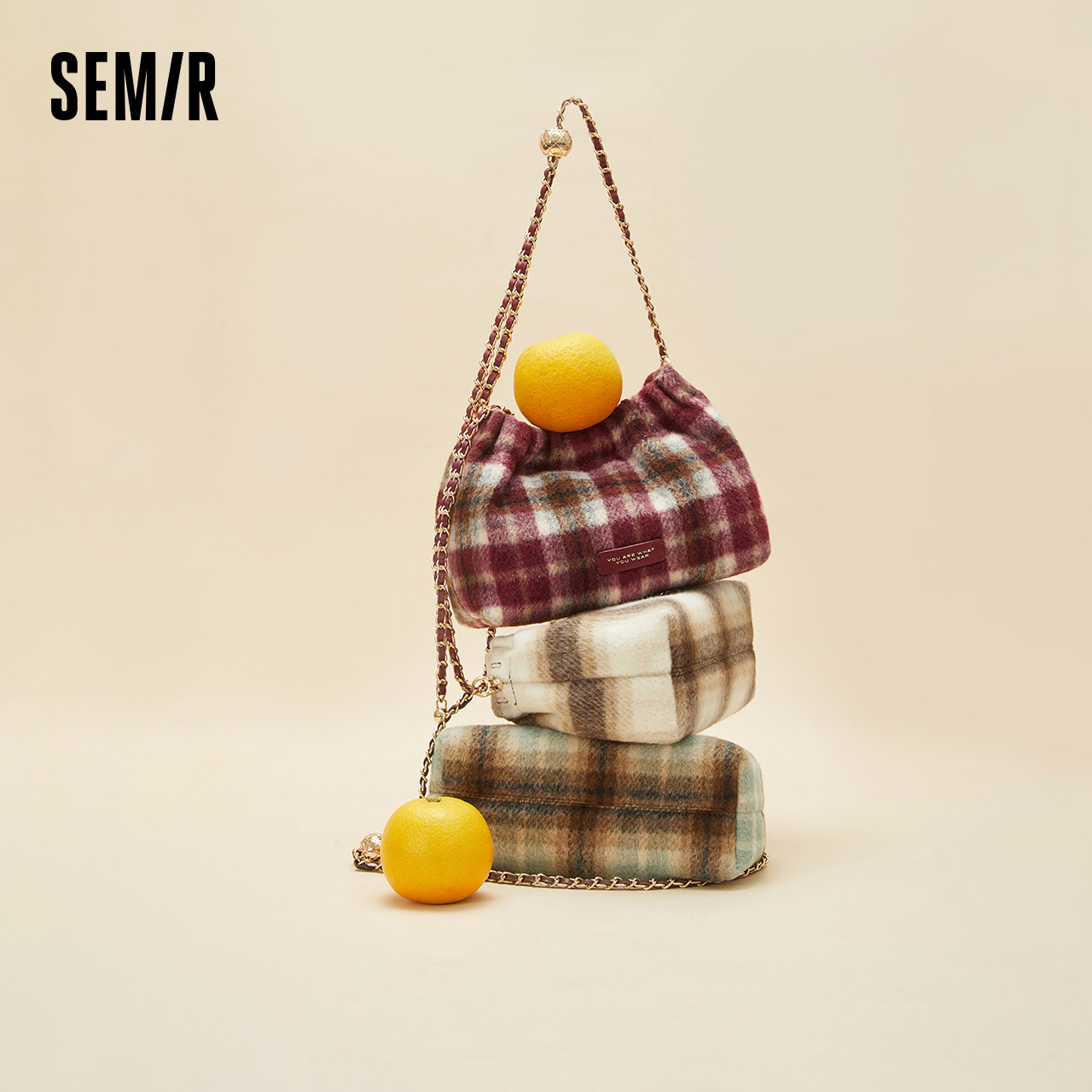 森马包包斜挎包女2024新款撞色格纹单肩包复古仿毛呢云吞包链条包