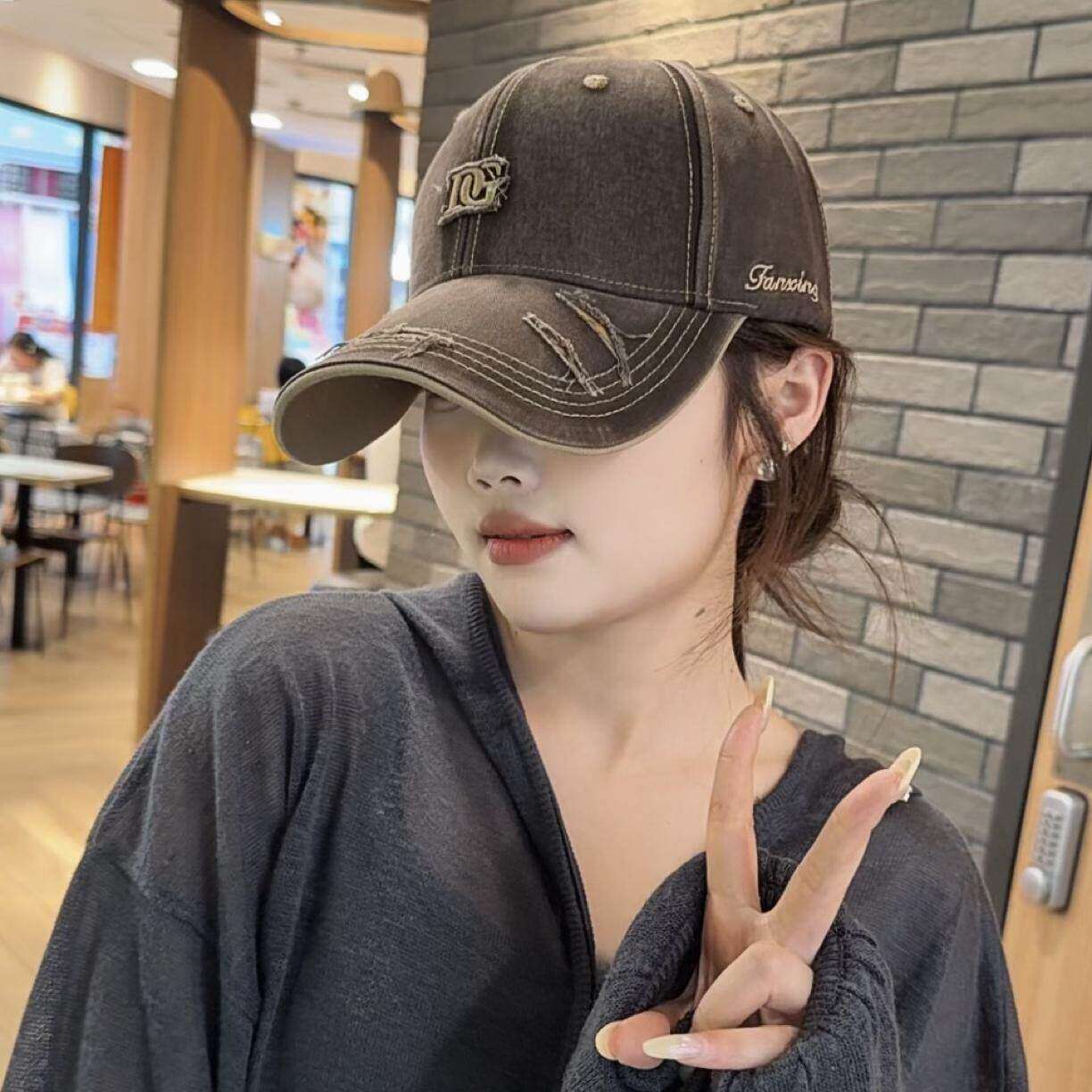 美式复古硬顶帽子女士春秋新款街头棒球帽男字母破洞鸭舌帽显脸小
