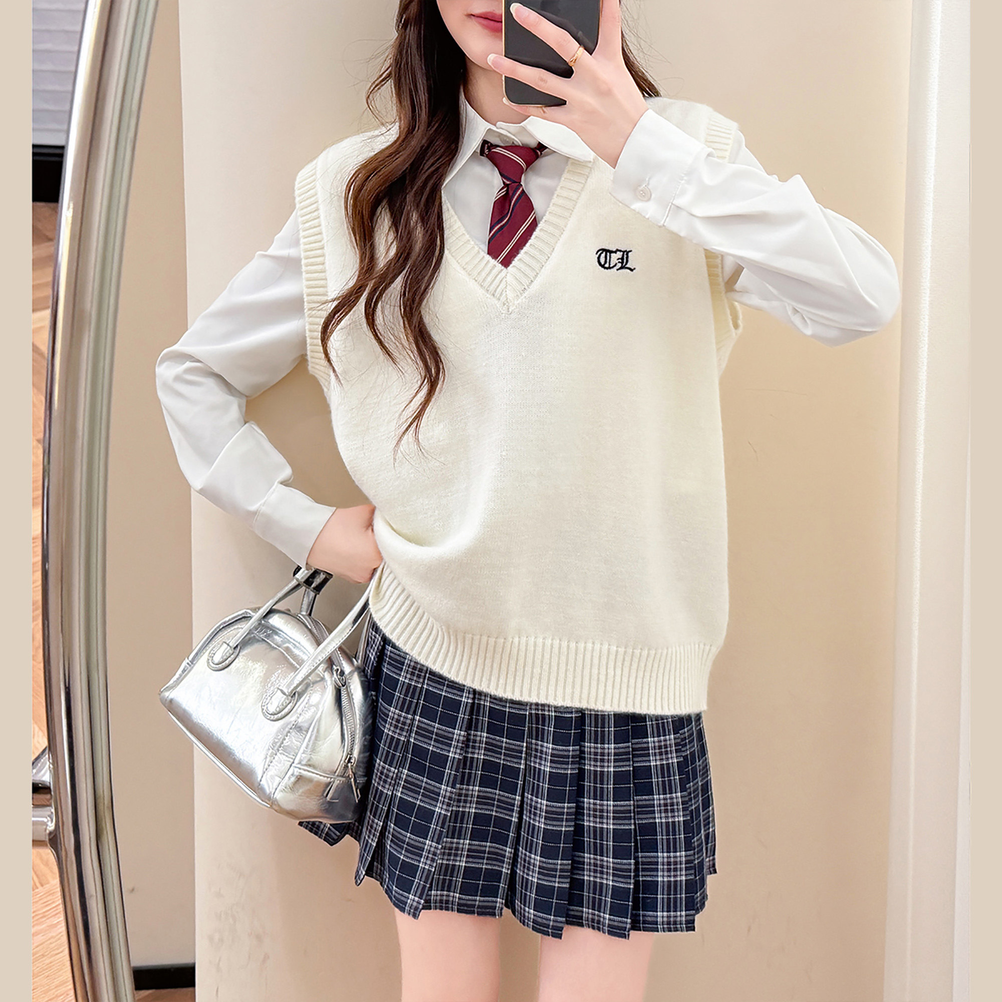 唐狮秋冬新款V领针织衫女毛衣背心白色马甲简约小刺绣上衣ydTD
