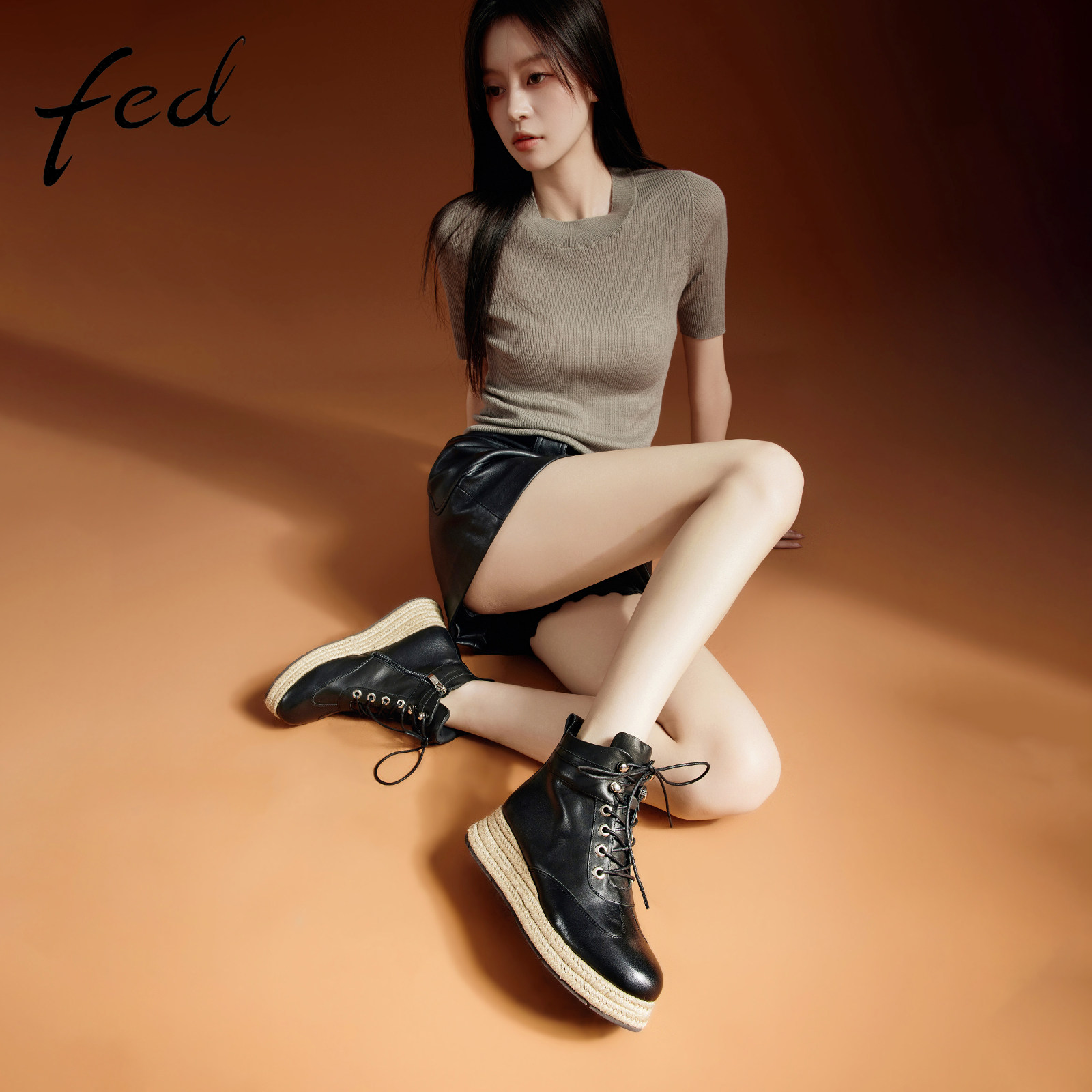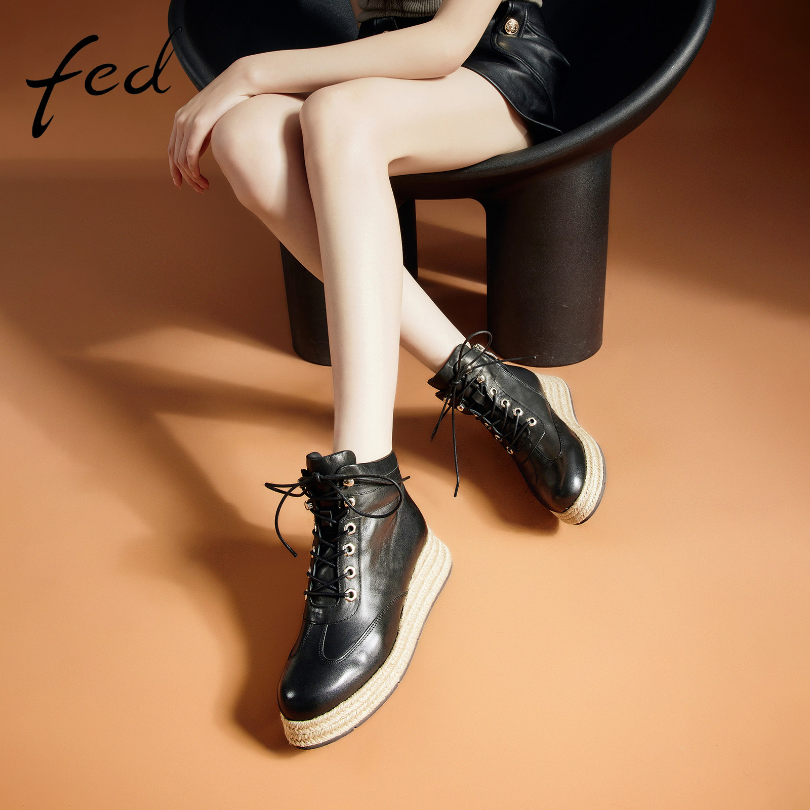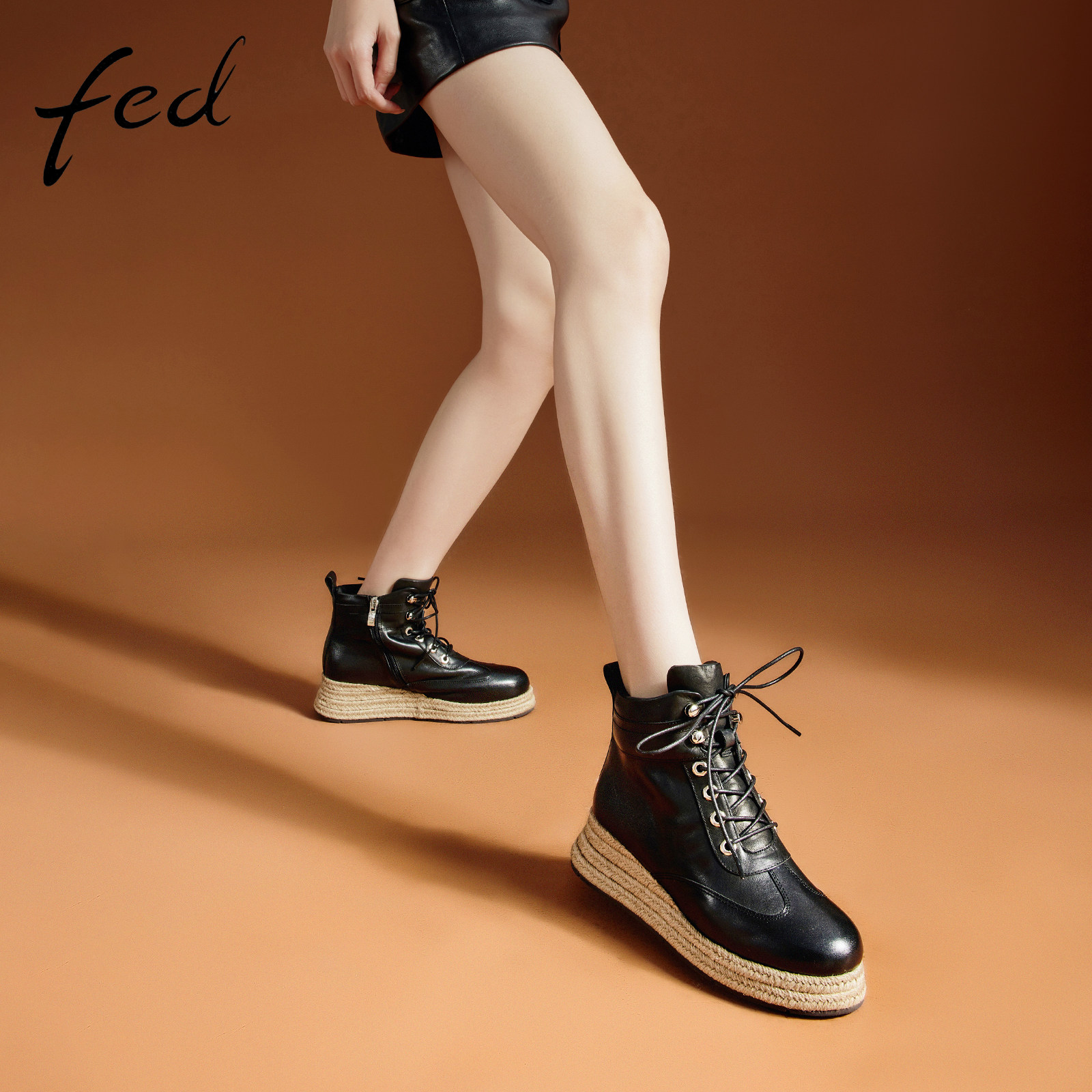 fed厚底马丁靴冬季新款女靴黑色真皮短靴坡跟休闲鞋女D1015-ZF253