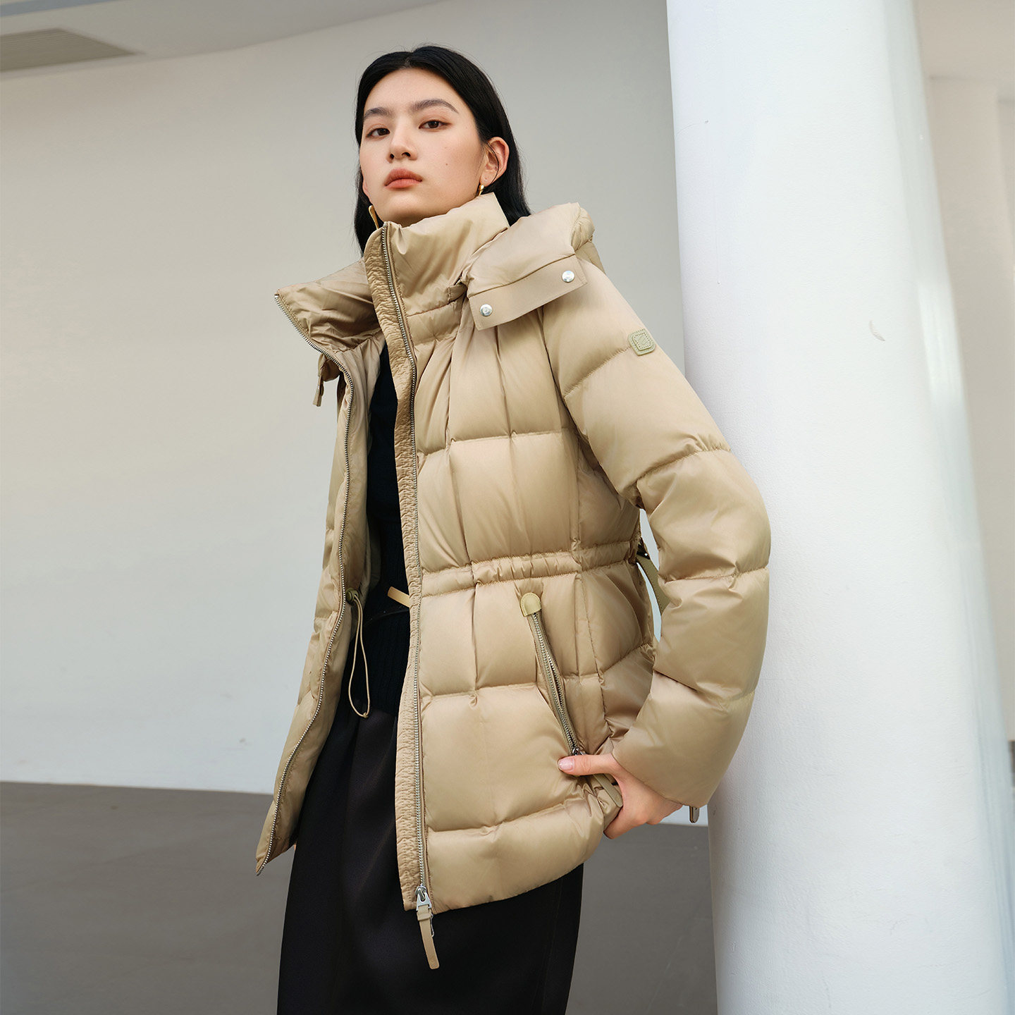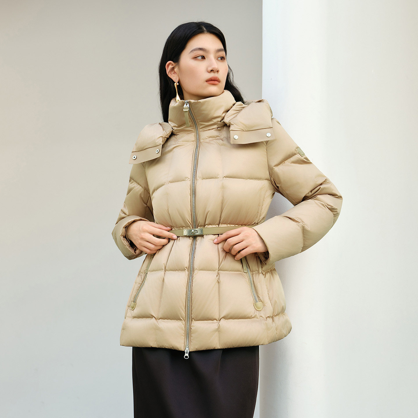 艾莱依短款羽绒服女士冬防风立领时尚气质连帽收腰鹅绒服爆款正品