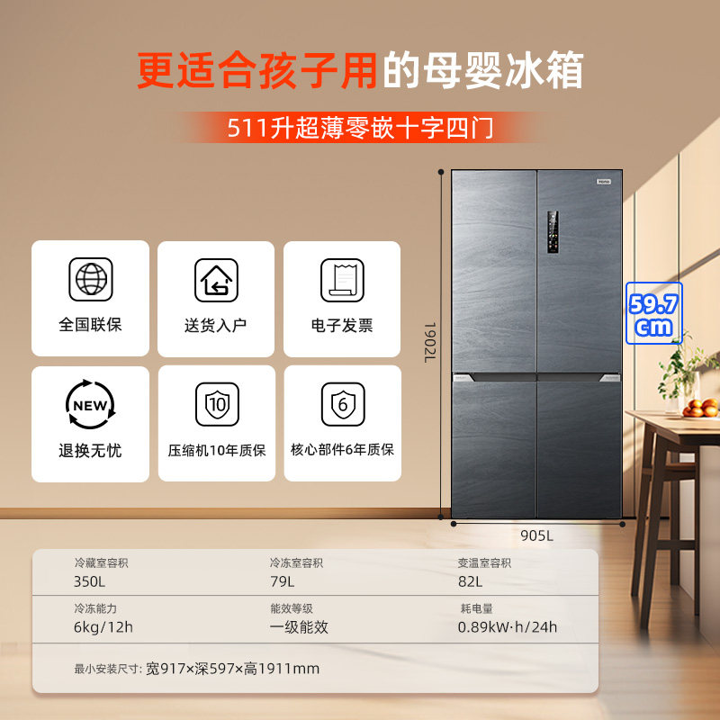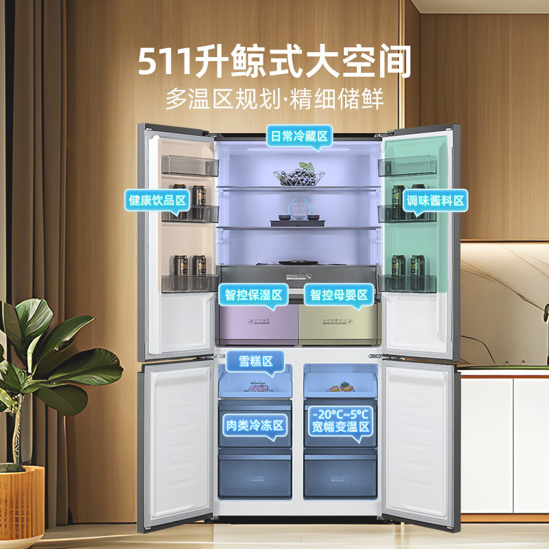 政府补贴海尔出品统帅悦己懒人510十字对开四门超薄一级家用冰箱