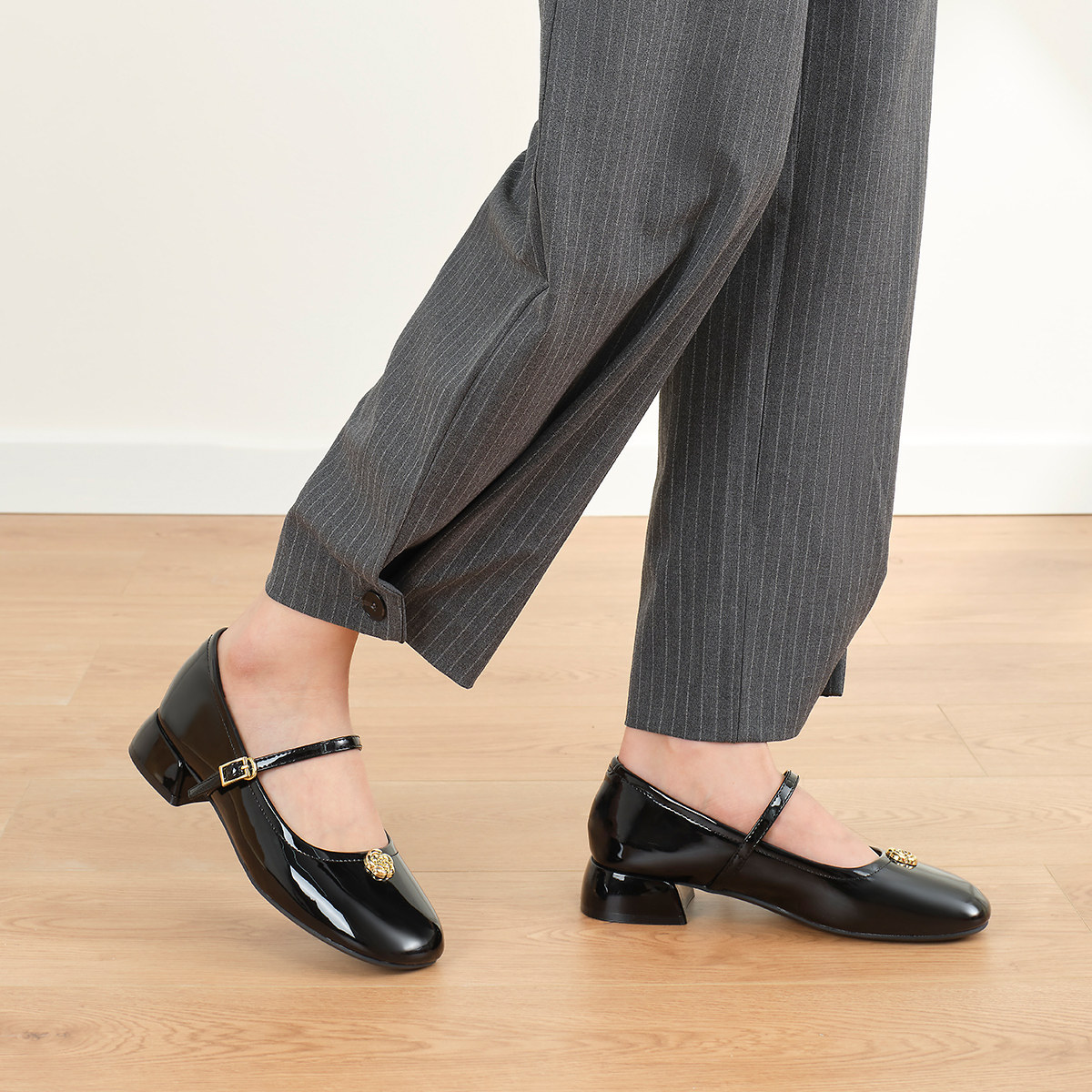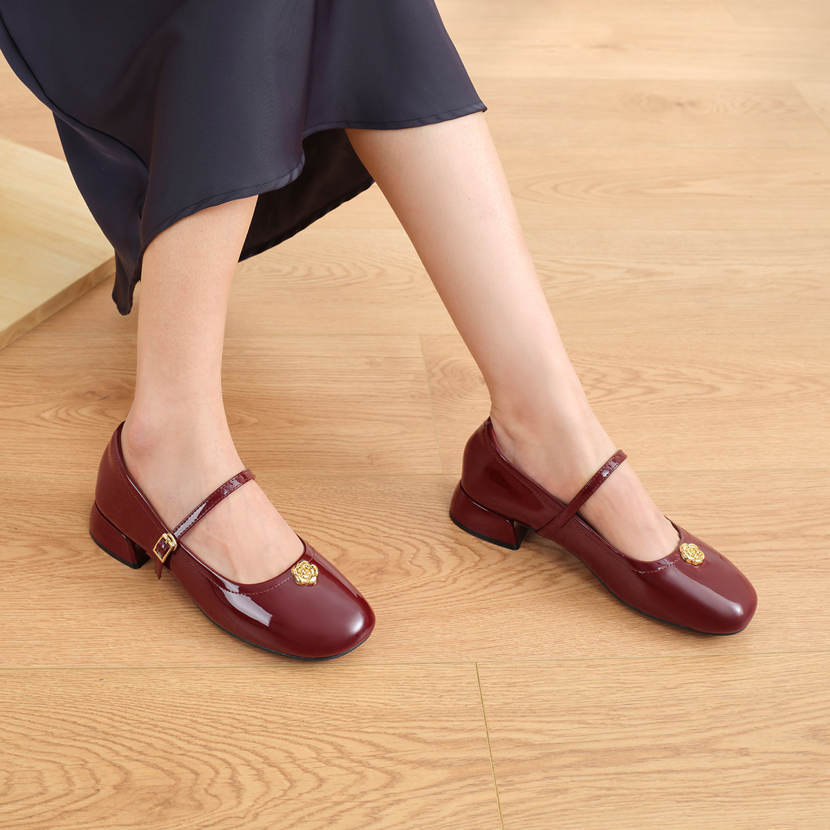 真皮~骄屿复古浅口高跟鞋山茶花一字扣粗跟单鞋尖头气质玛丽珍鞋