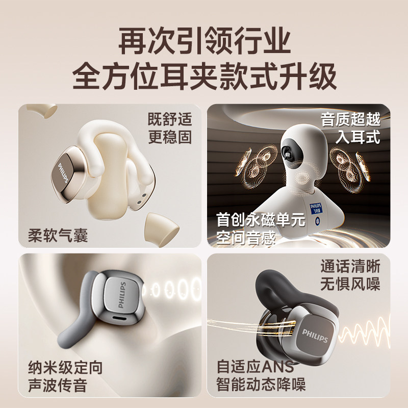 飞利浦TAQ4220蓝牙耳机不入耳夹式无线2025新款运动跑步通话降噪