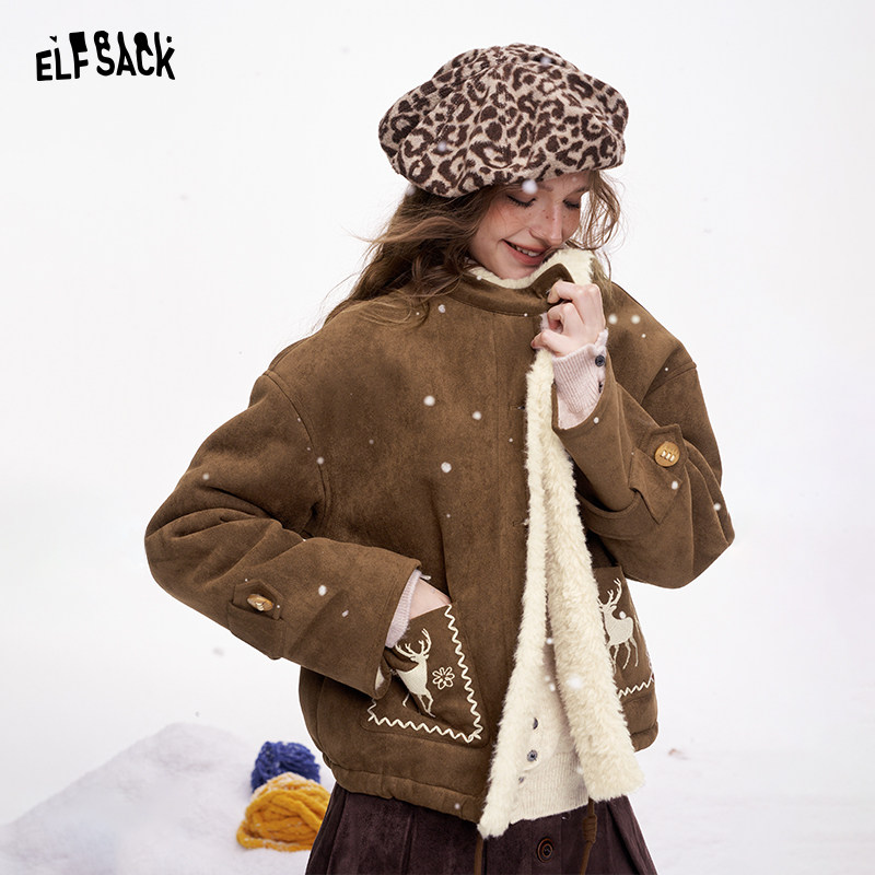 妖精的口袋粉色皮毛一体毛呢外套女2025年冬季新款小个子加厚外套