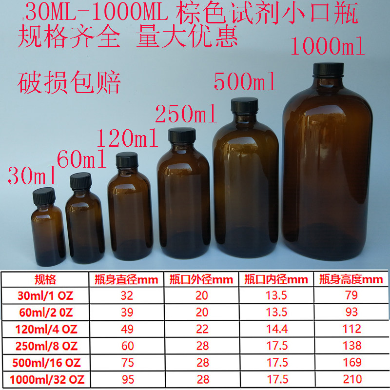 500ml1000m棕色l透明小口试剂瓶纯露250ml玻璃波斯顿瓶遮光精油瓶