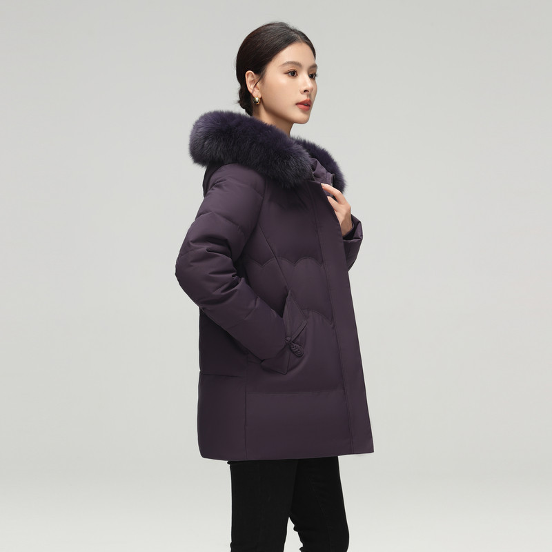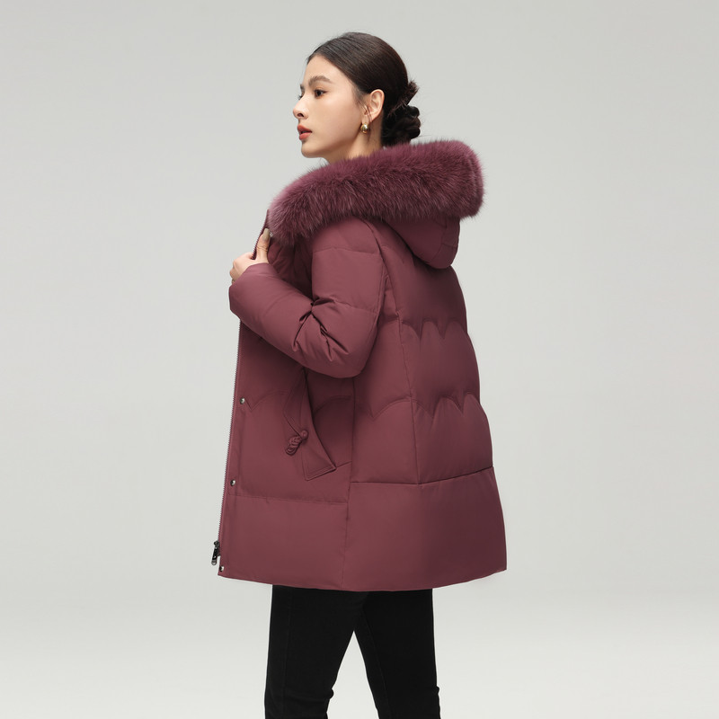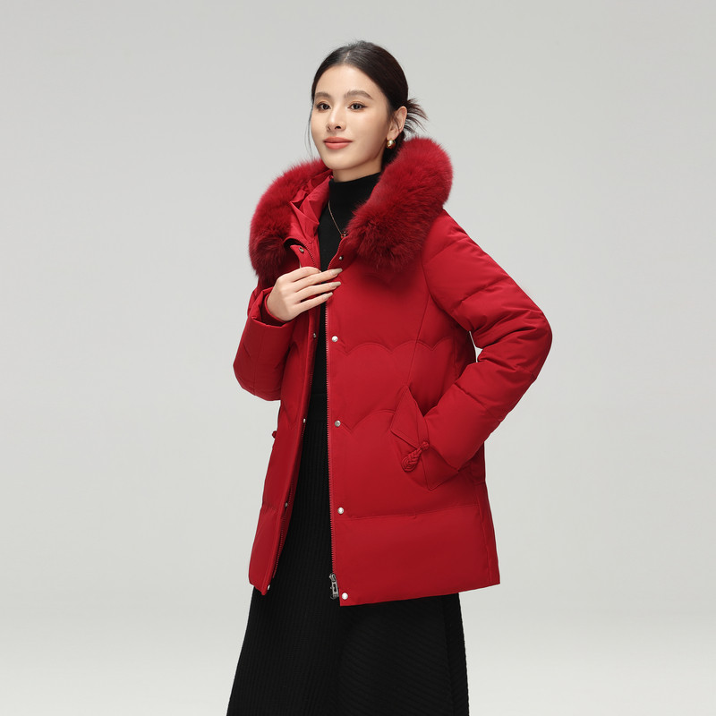 雪中飞2024冬新款妈妈款短款羽绒服连帽狐狸毛领纯色简约中国风