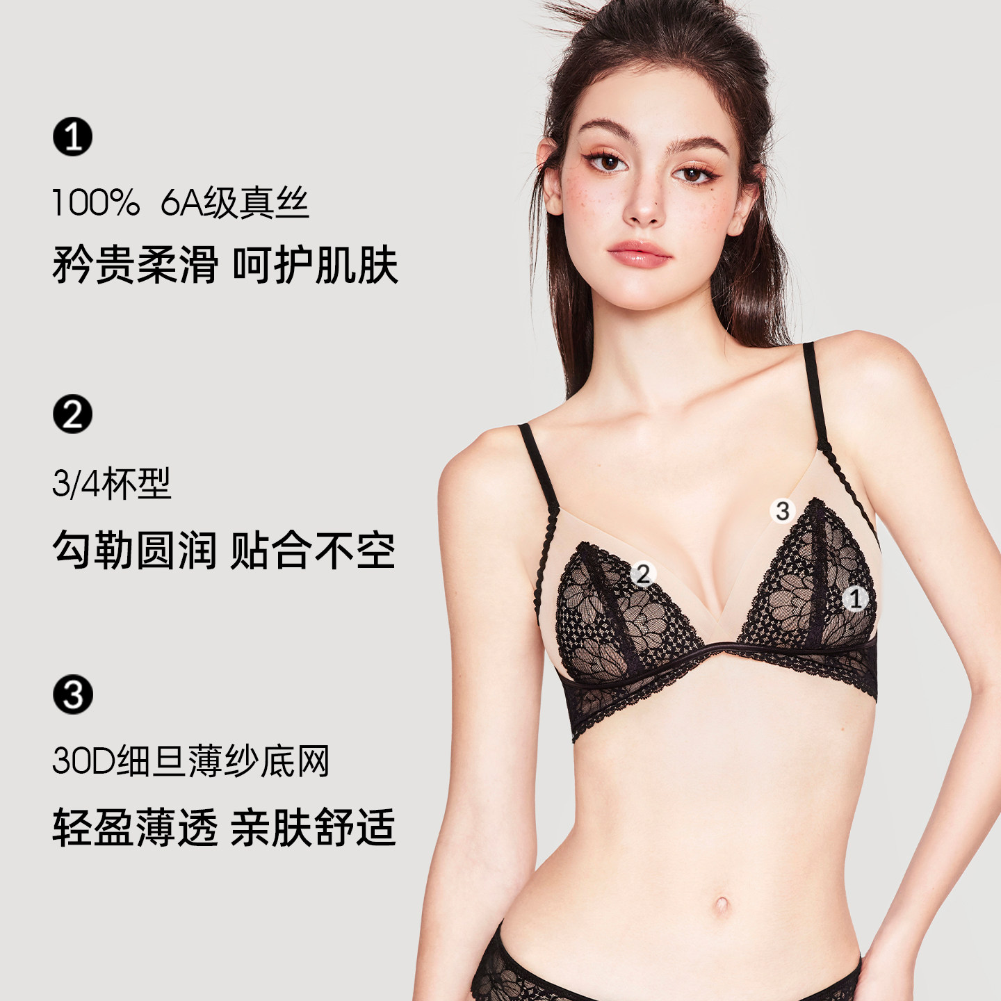 好奇蜜斯法式内衣女蕾丝真丝文胸罩三角杯桑蚕丝25夏薄无钢圈美背