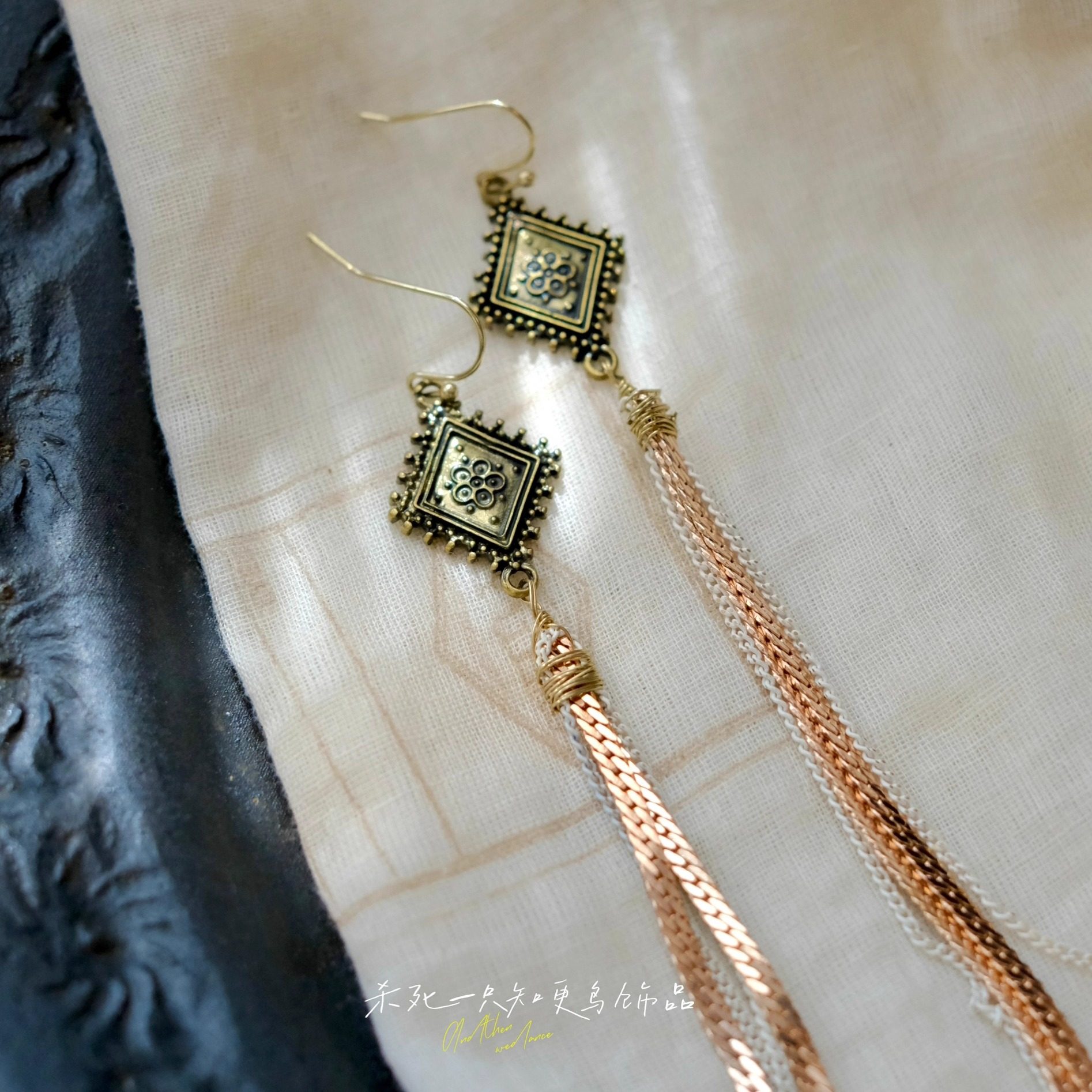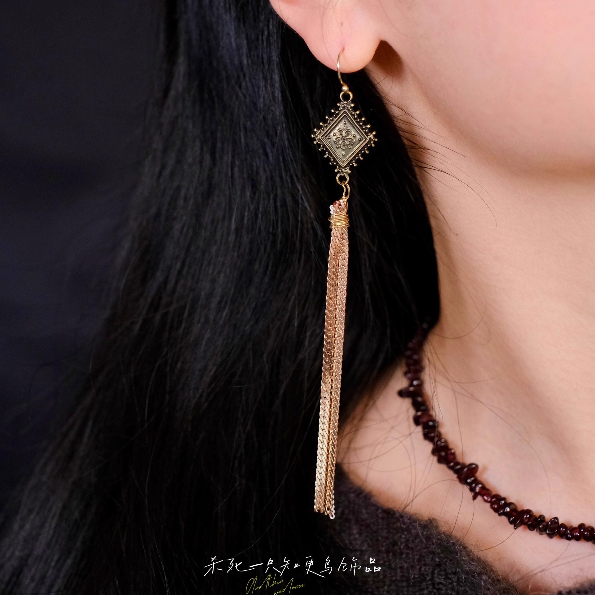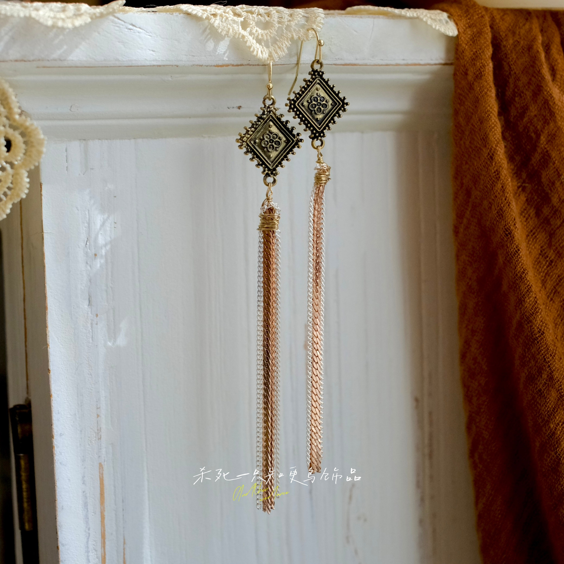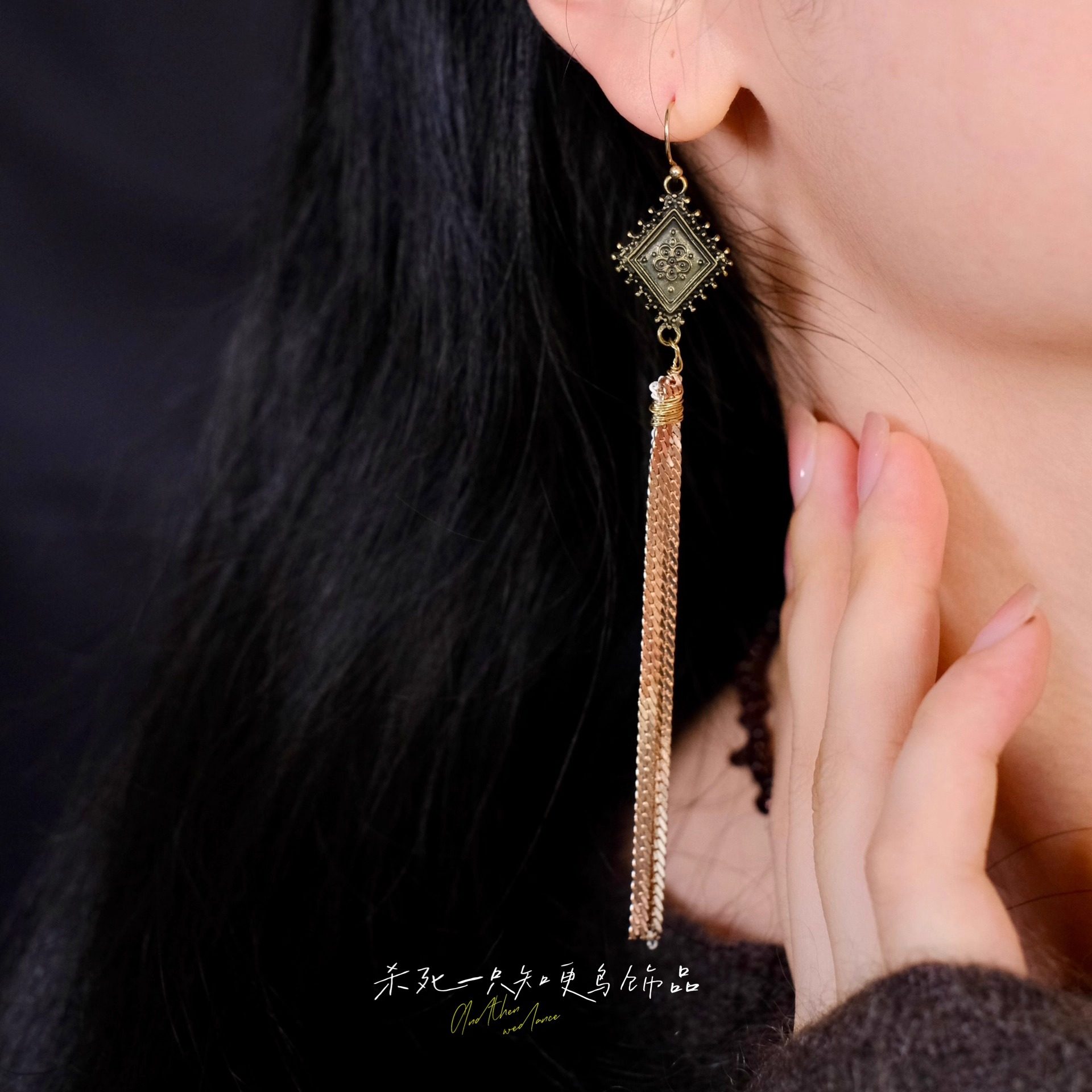 《牧野诗歌》复古文艺民族风古铜雕花长款流苏小众耳环耳夹耳饰女