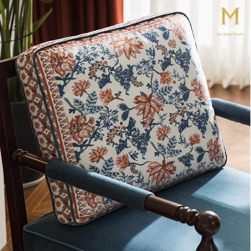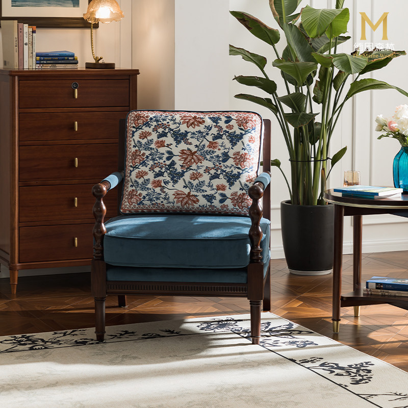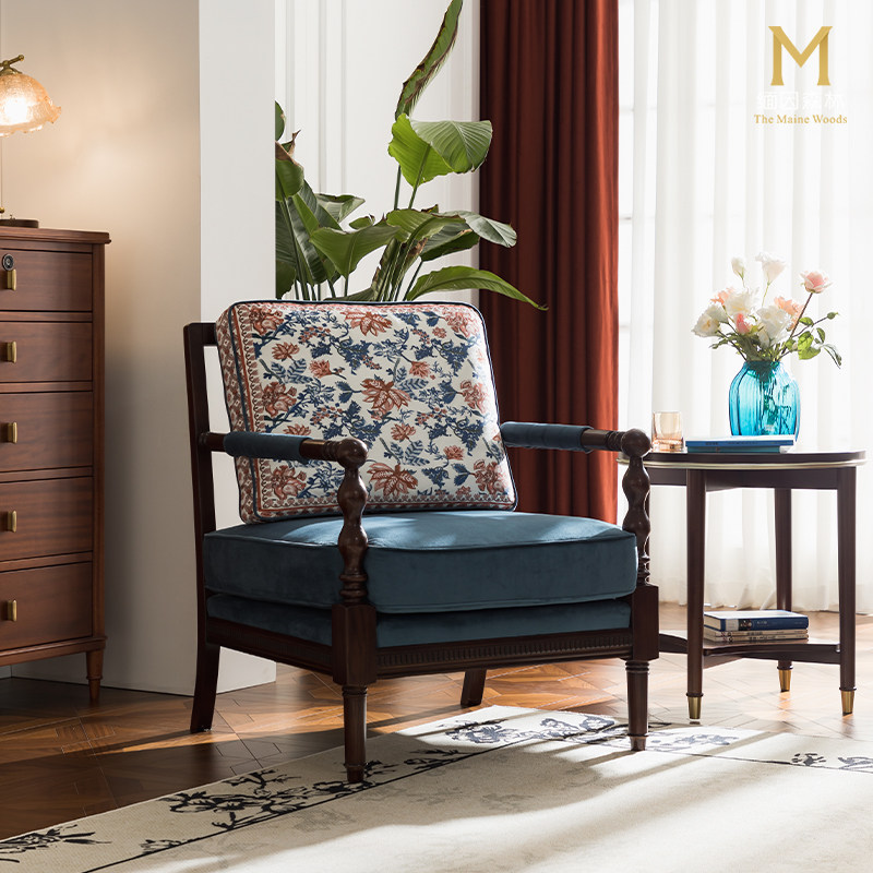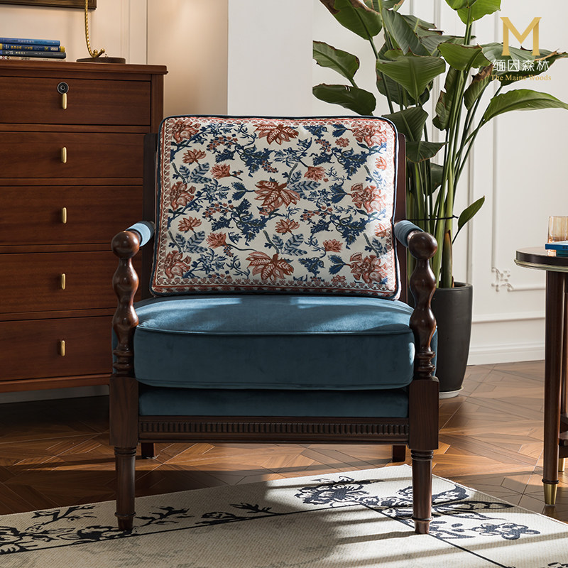 蓝色沙发椅单人休闲椅布艺沙发老虎凳复古实木沙发客厅主人椅