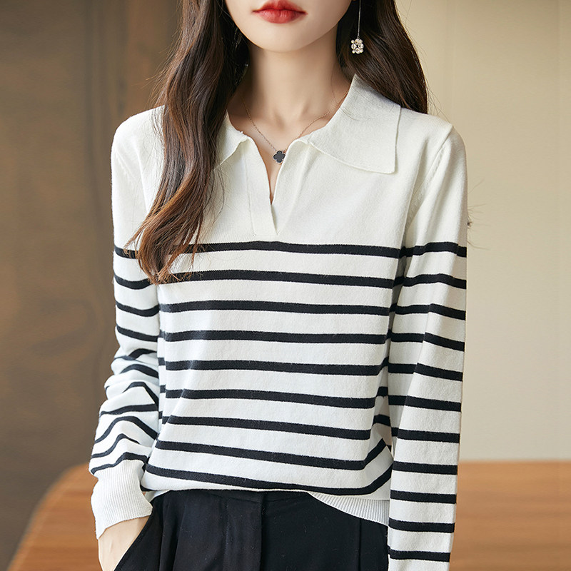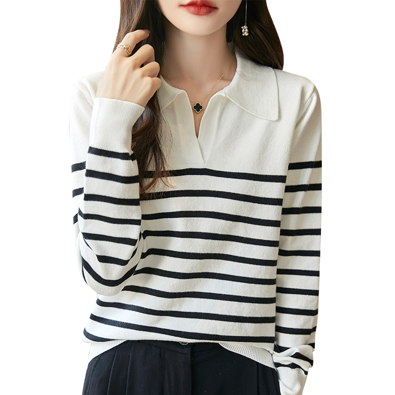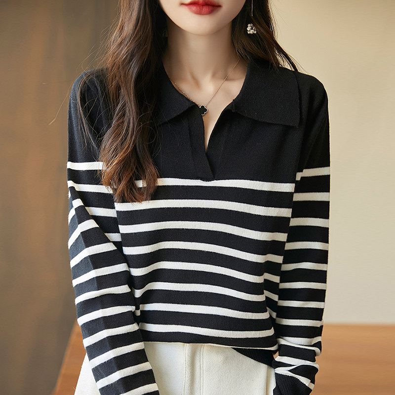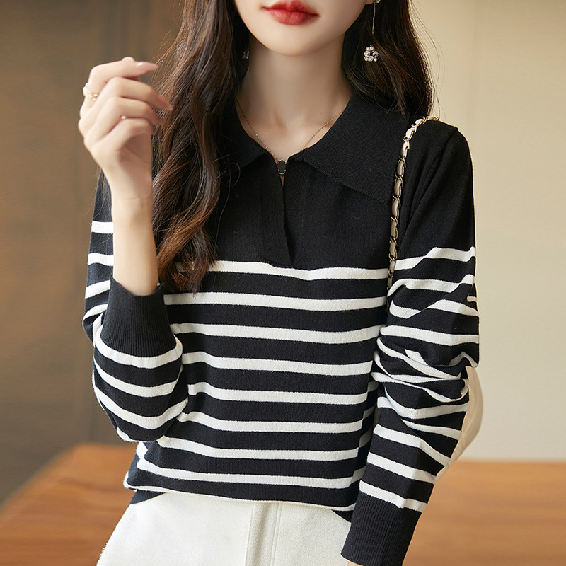 撤柜撤标(A)翻领条纹针织打底衫女春秋流行内搭上衣洋气女装毛衣