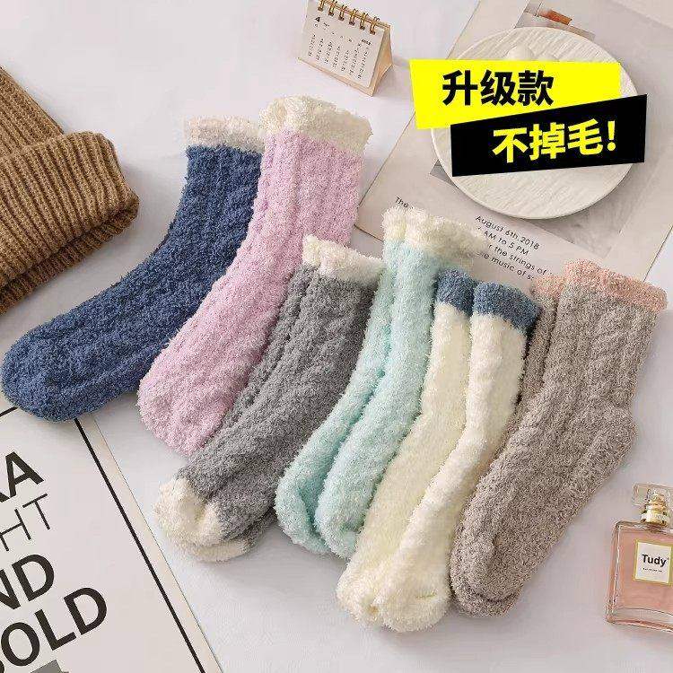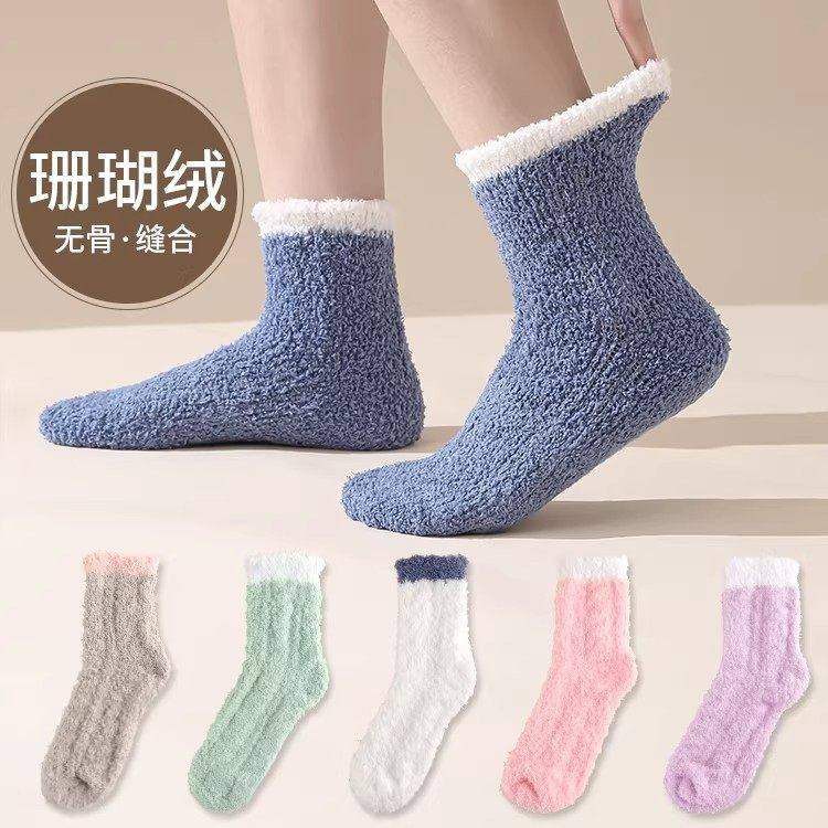 珊瑚绒袜子女秋冬季中筒袜女生冬天居家睡眠月子袜加绒加厚地板袜