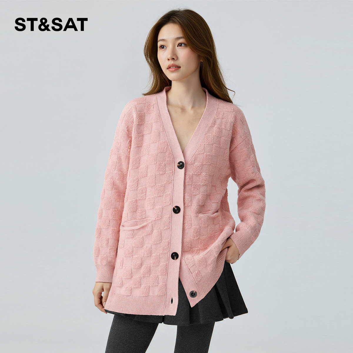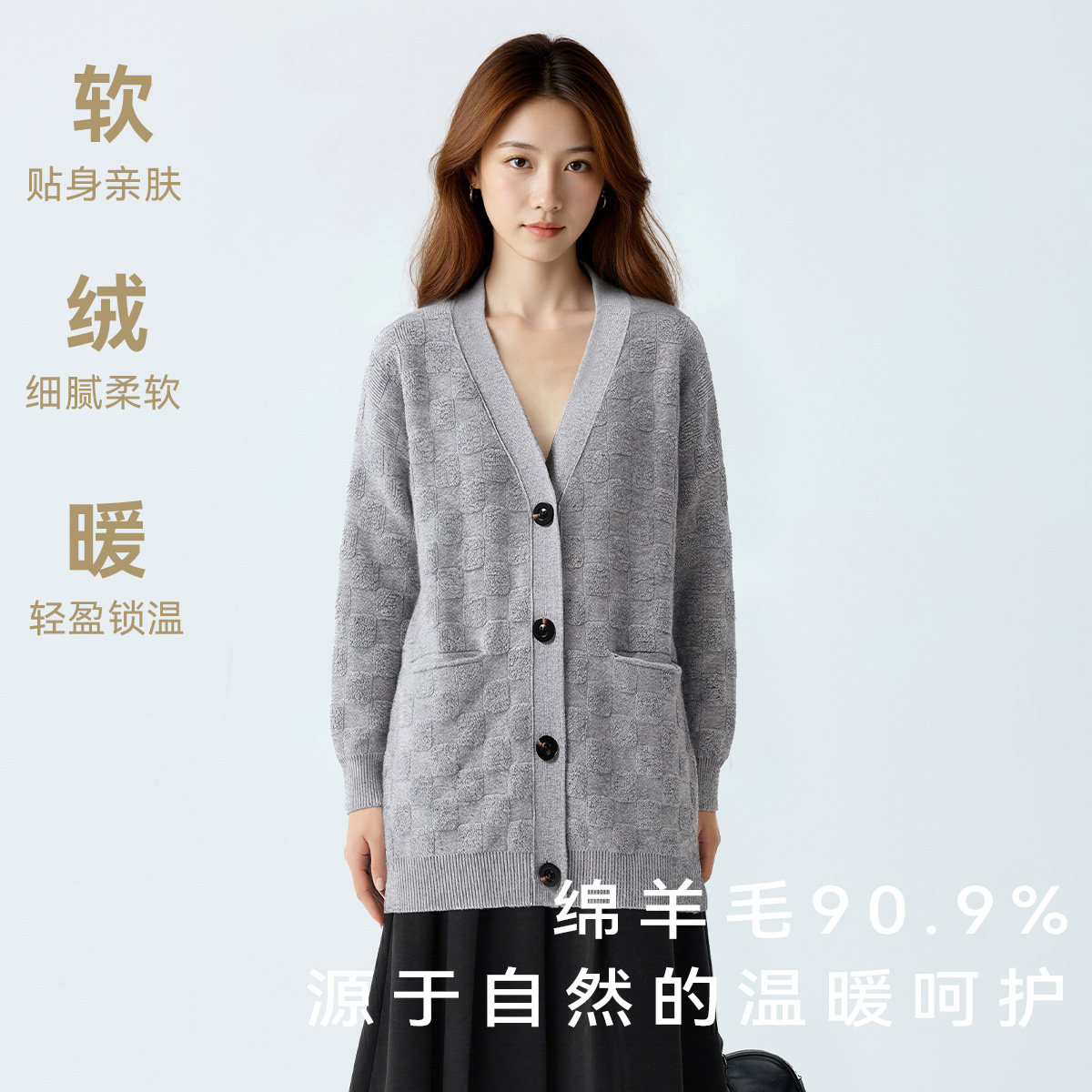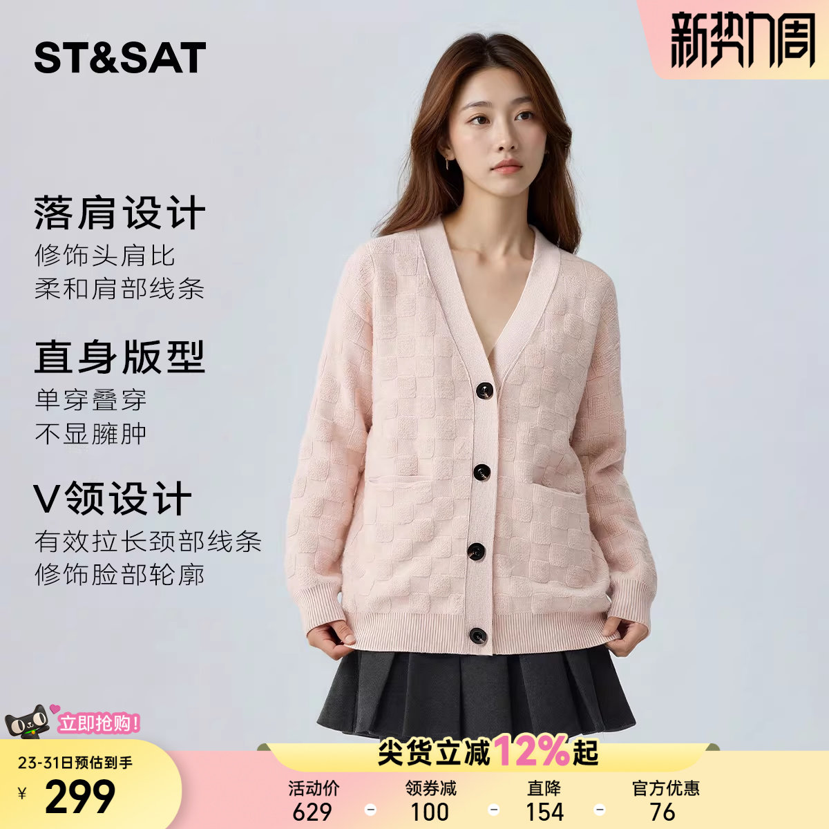 【100%绵羊毛】星期六开衫V领毛衣女春季新款软糯慵懒针织衫