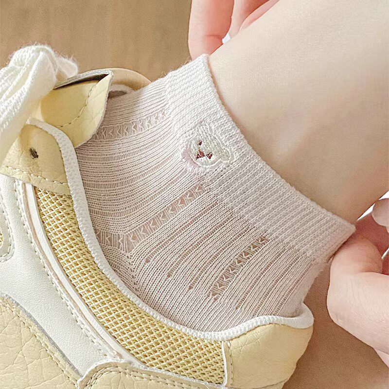 小熊袜子女夏季薄款短袜纯棉网眼透气防滑不掉跟刺绣儿童可爱船袜