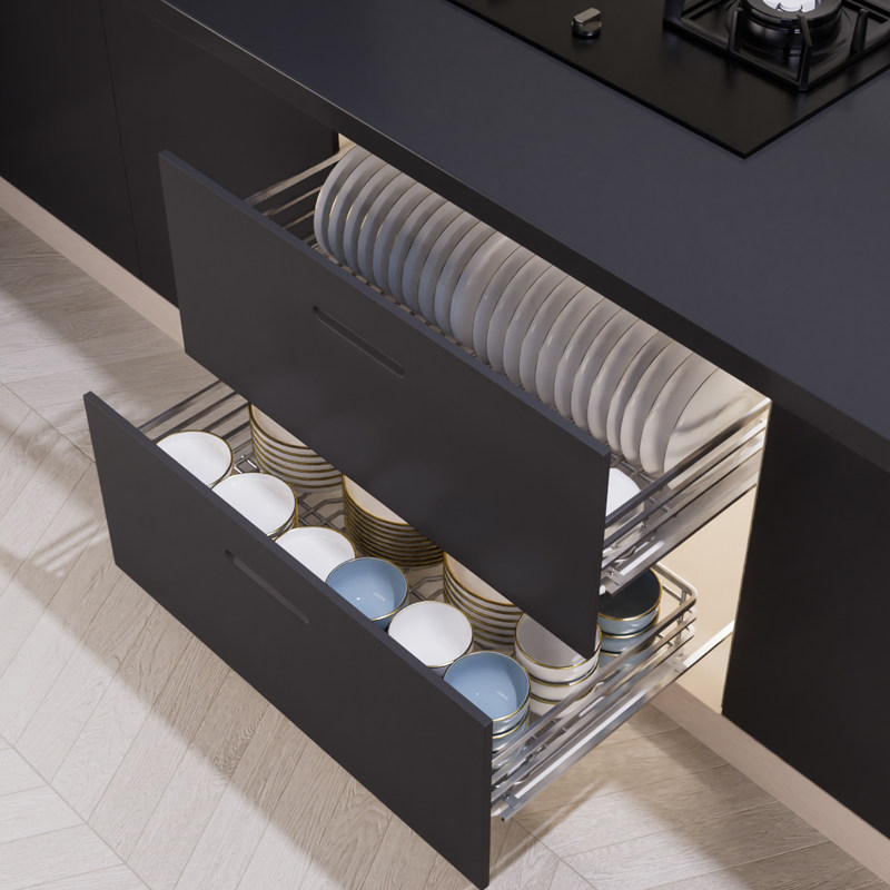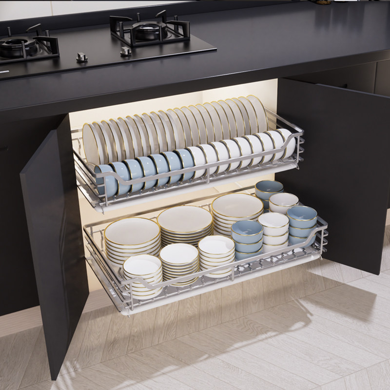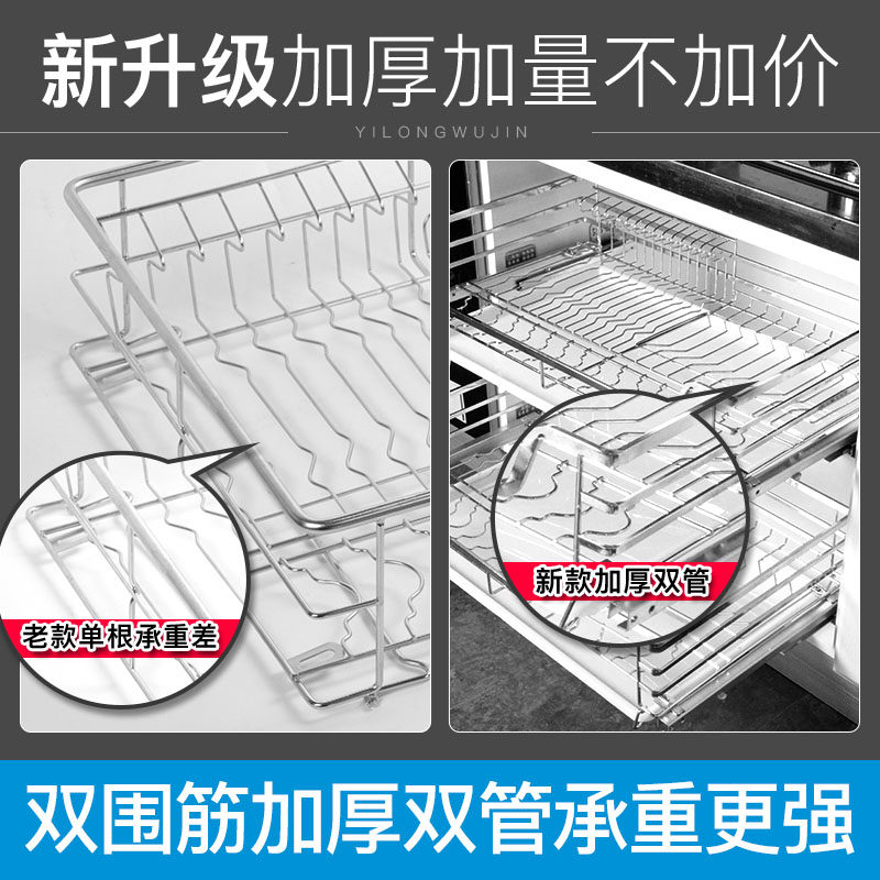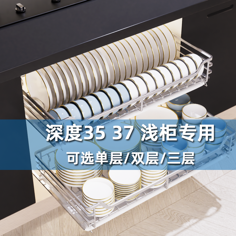 35 37浅深度浅柜拉篮304不锈钢厨房橱柜碗碟篮架双层抽屉式缓冲轨