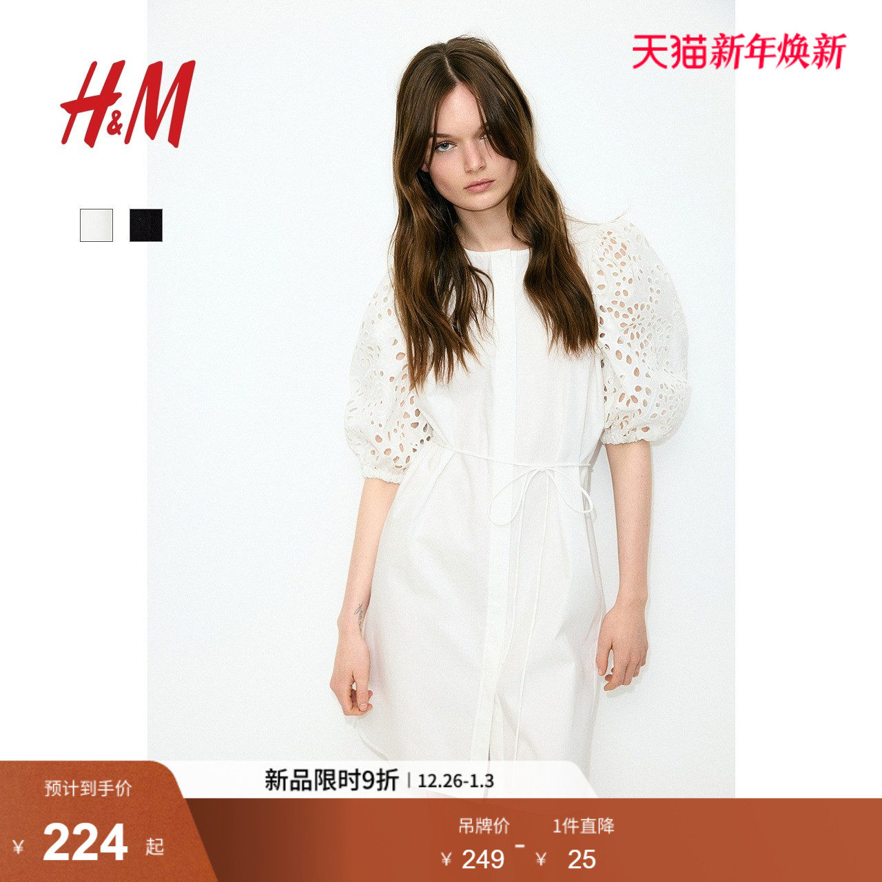 HM女装连衣裙冬季泡泡袖镂空刺绣圆领束腰及膝裙1275625