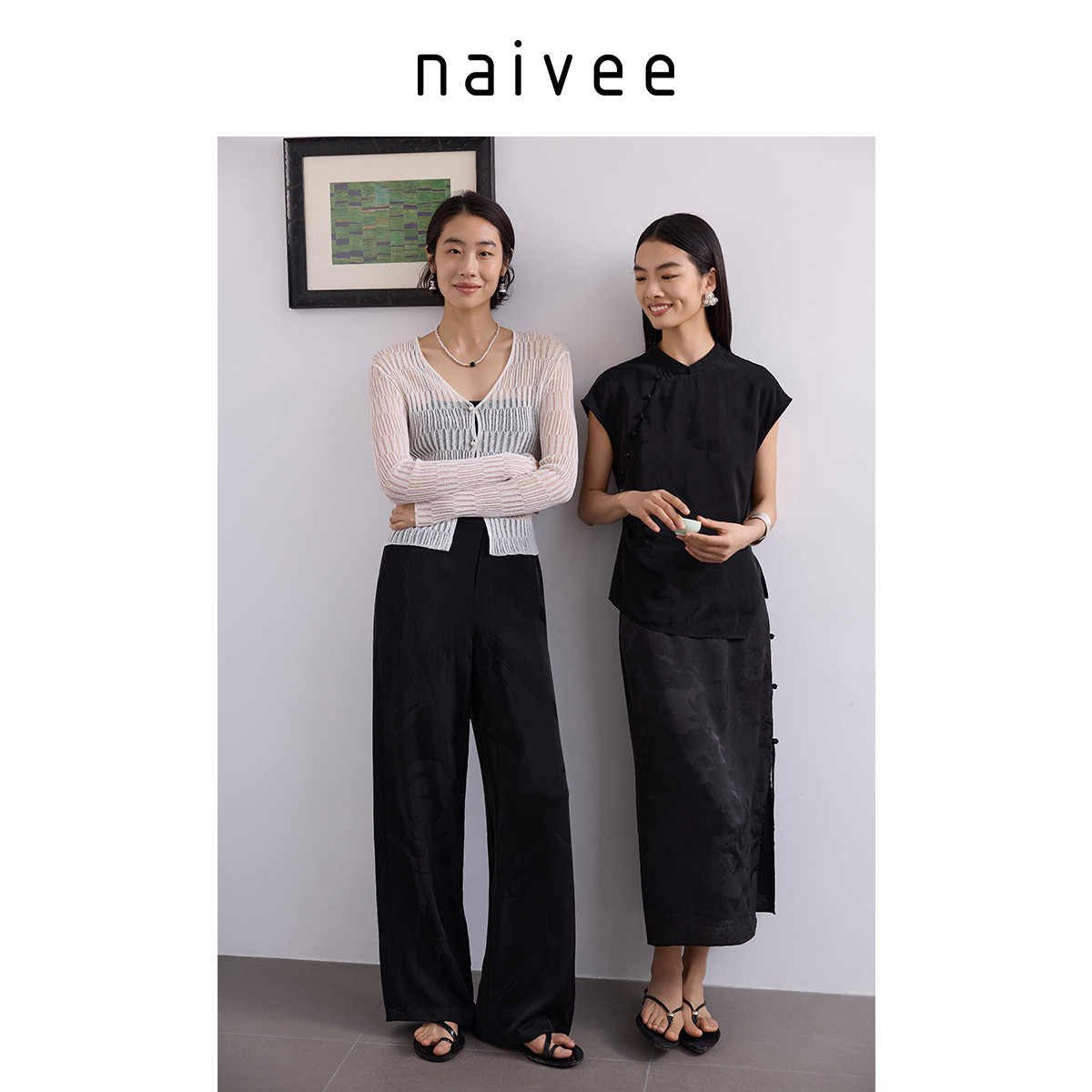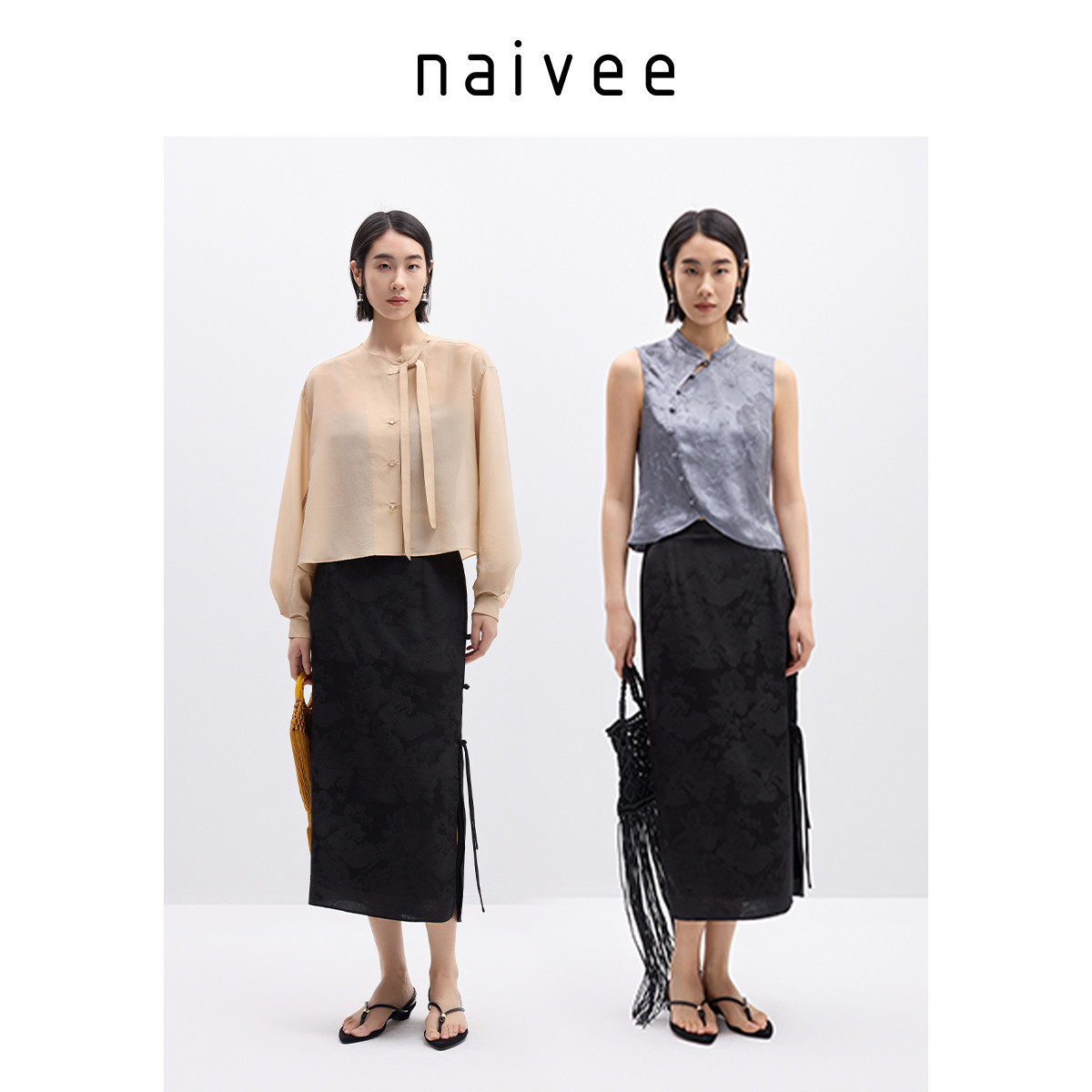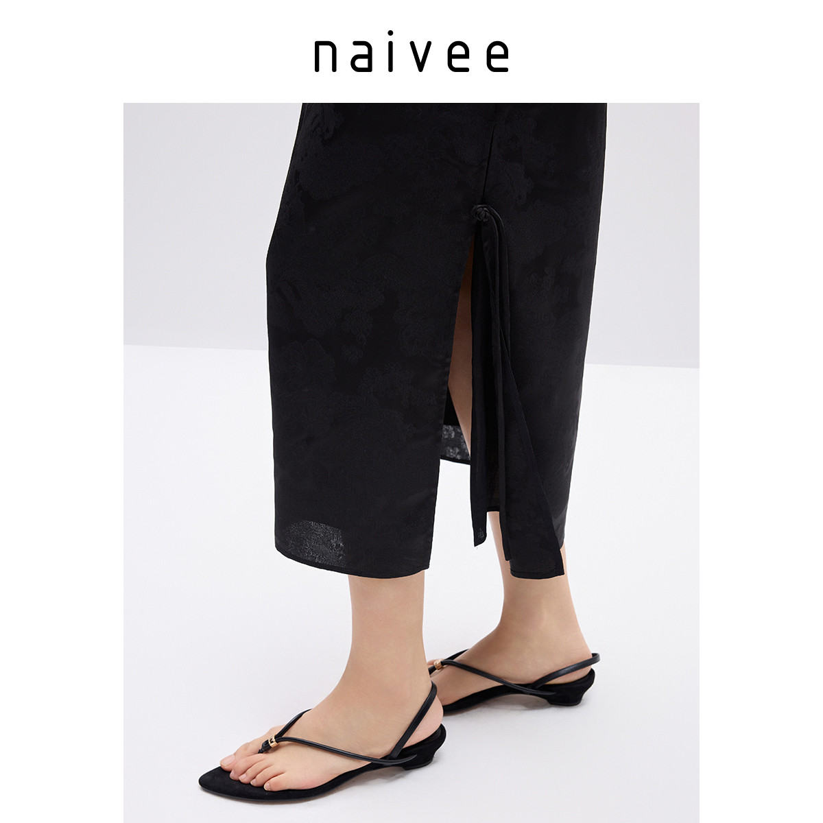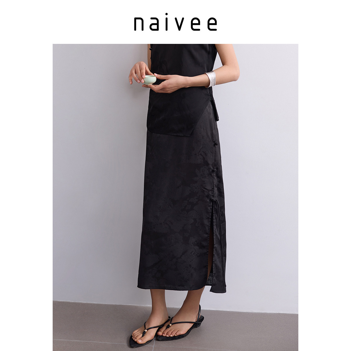 naivee纳薇黑色新中式提花直筒裙25夏新款侧开衩盘扣半身裙长款