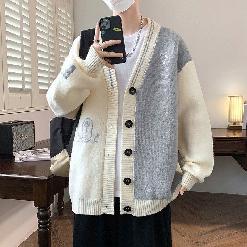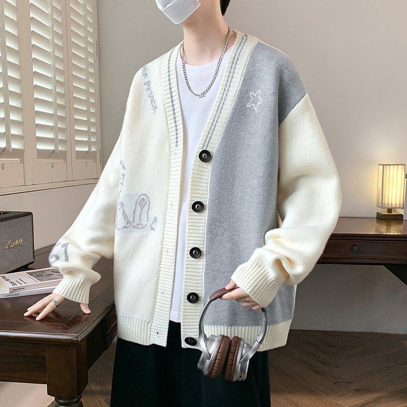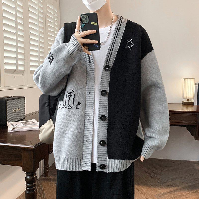 V领开衫毛衣男2025新款撞色针织衫夹克男秋冬季痞帅毛线衣褂子男
