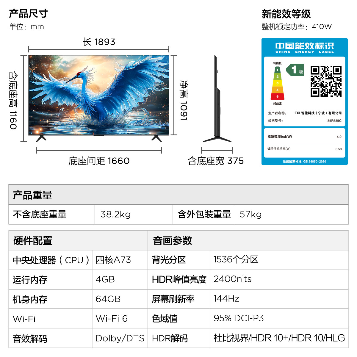 雷鸟鹤7 24款85英寸MiniLED千级分区144Hz高刷智能电视机85R685C