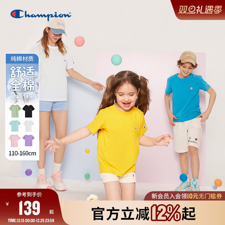 Champion冠军儿童装25夏季新款男女大小童亲子C标基础纯色短袖T恤