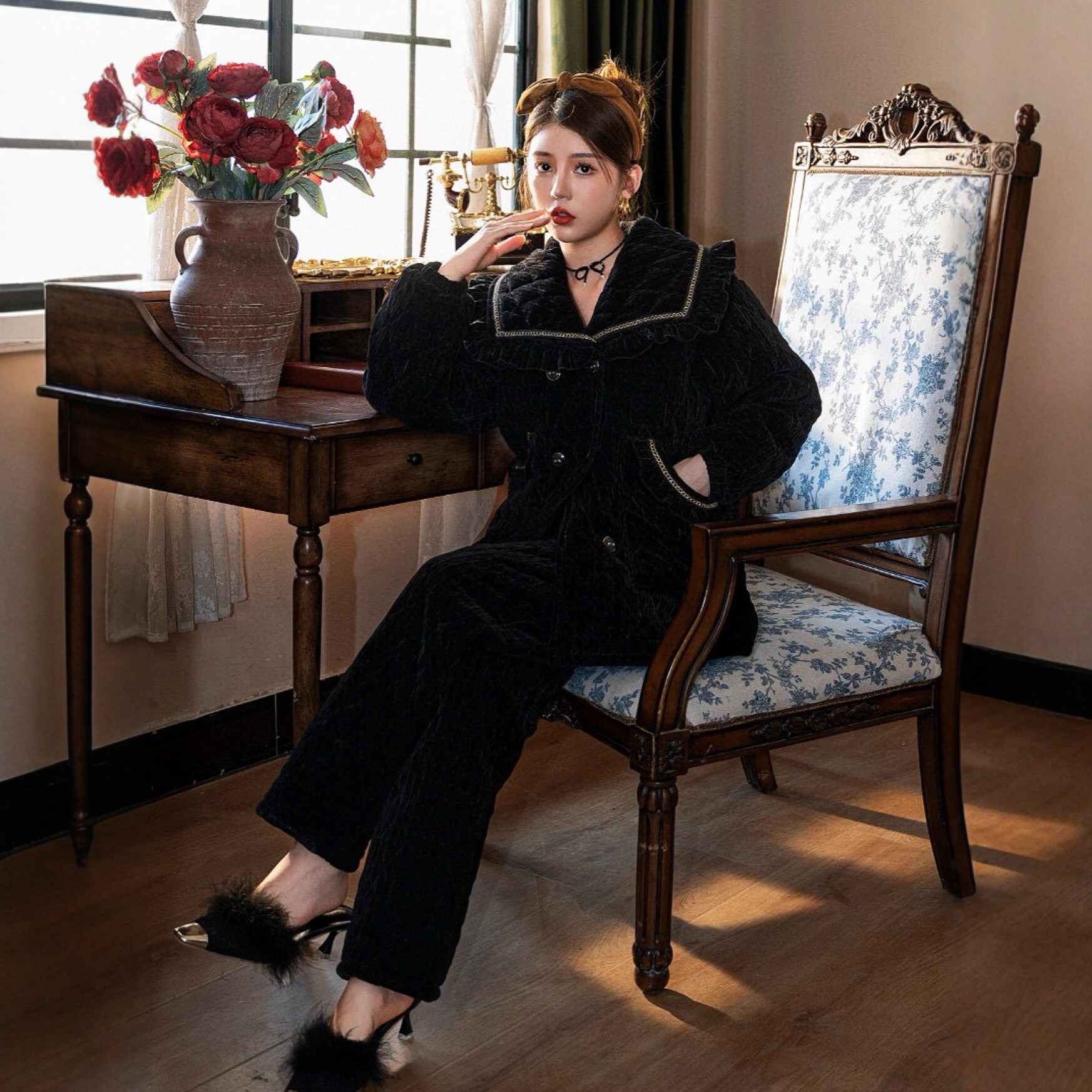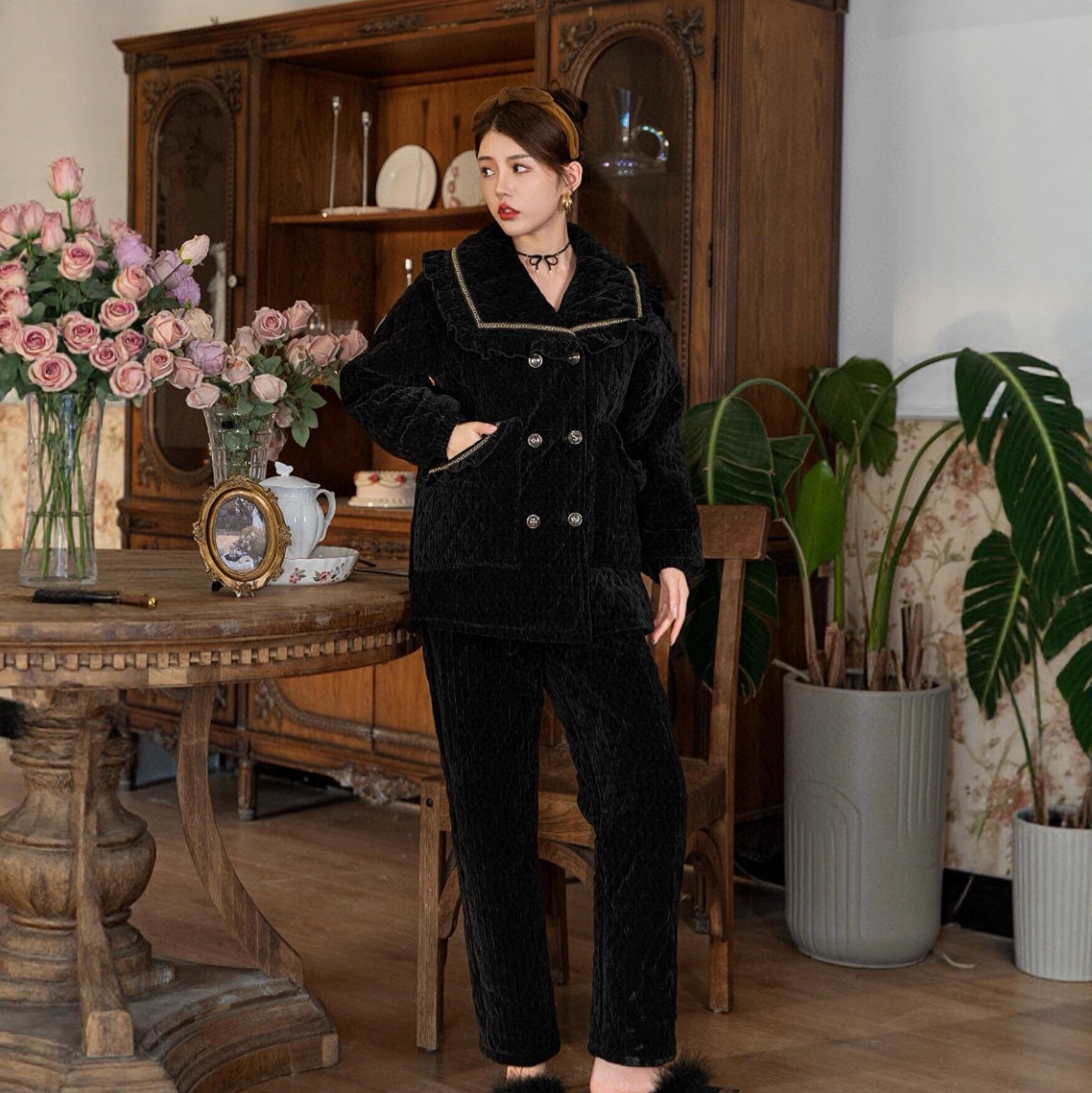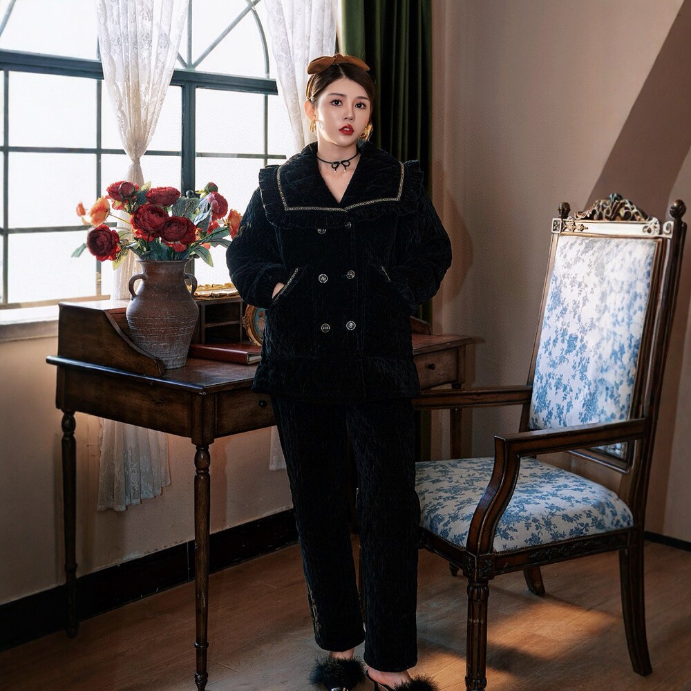 冬季三层夹棉加厚女睡衣雪尼尔绒翻领休闲保暖加珊瑚绒外穿家居服
