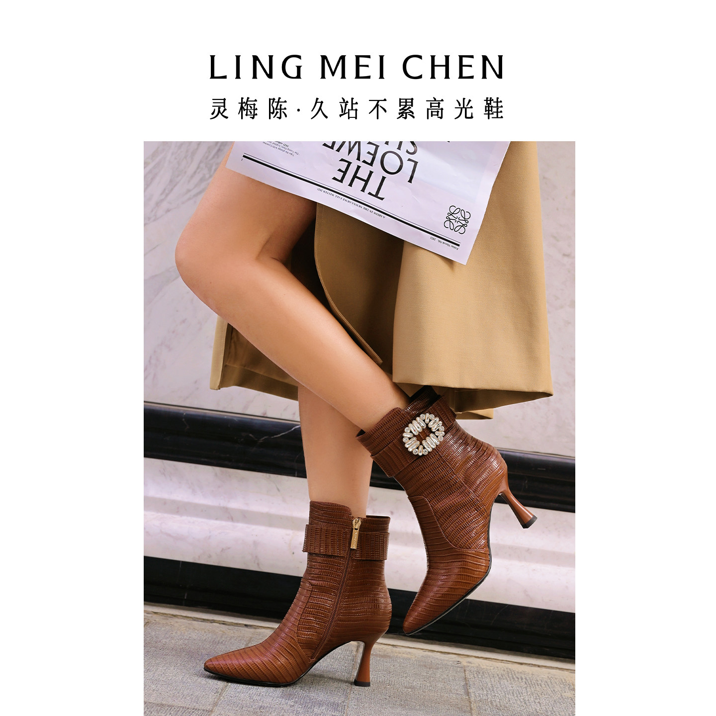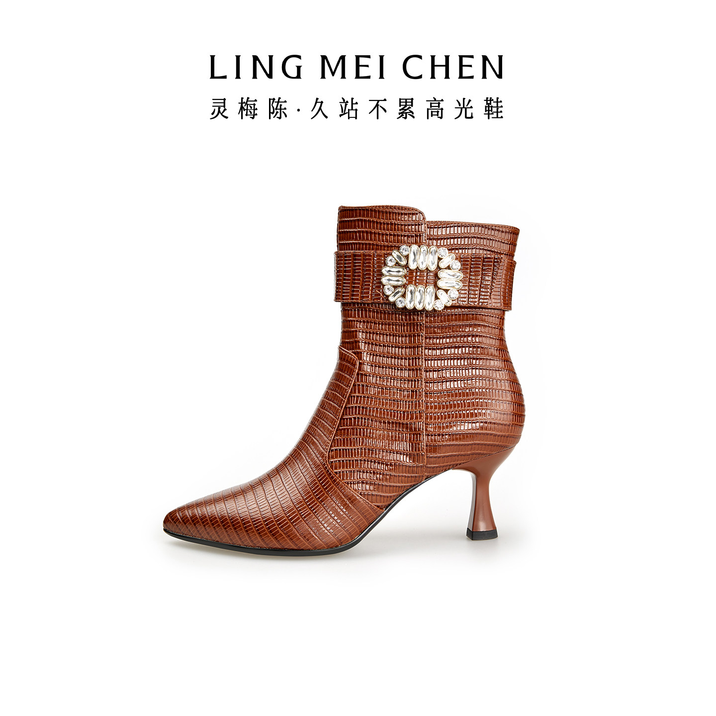 灵梅陈高光鞋压纹钻扣棕色靴子秋冬高跟靴尖头短靴女款美拉德皮靴