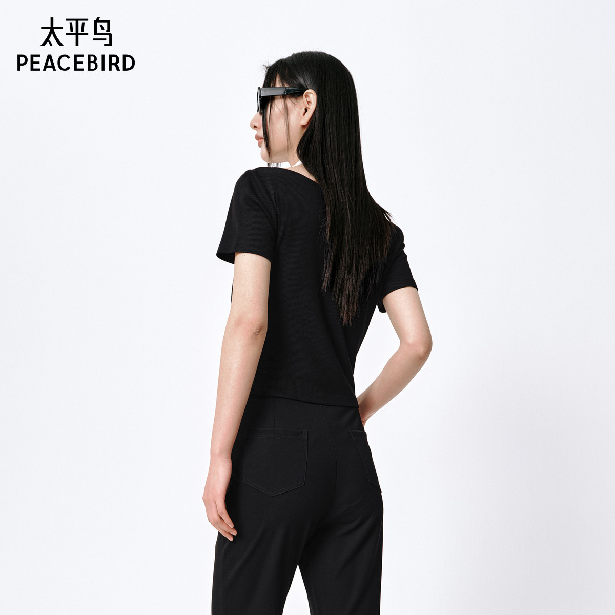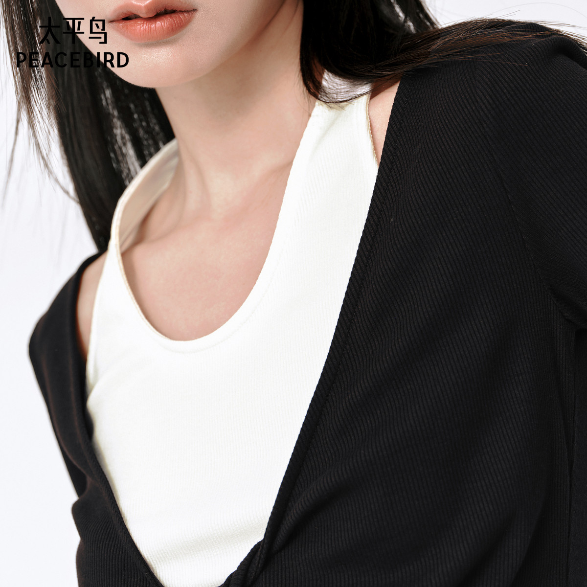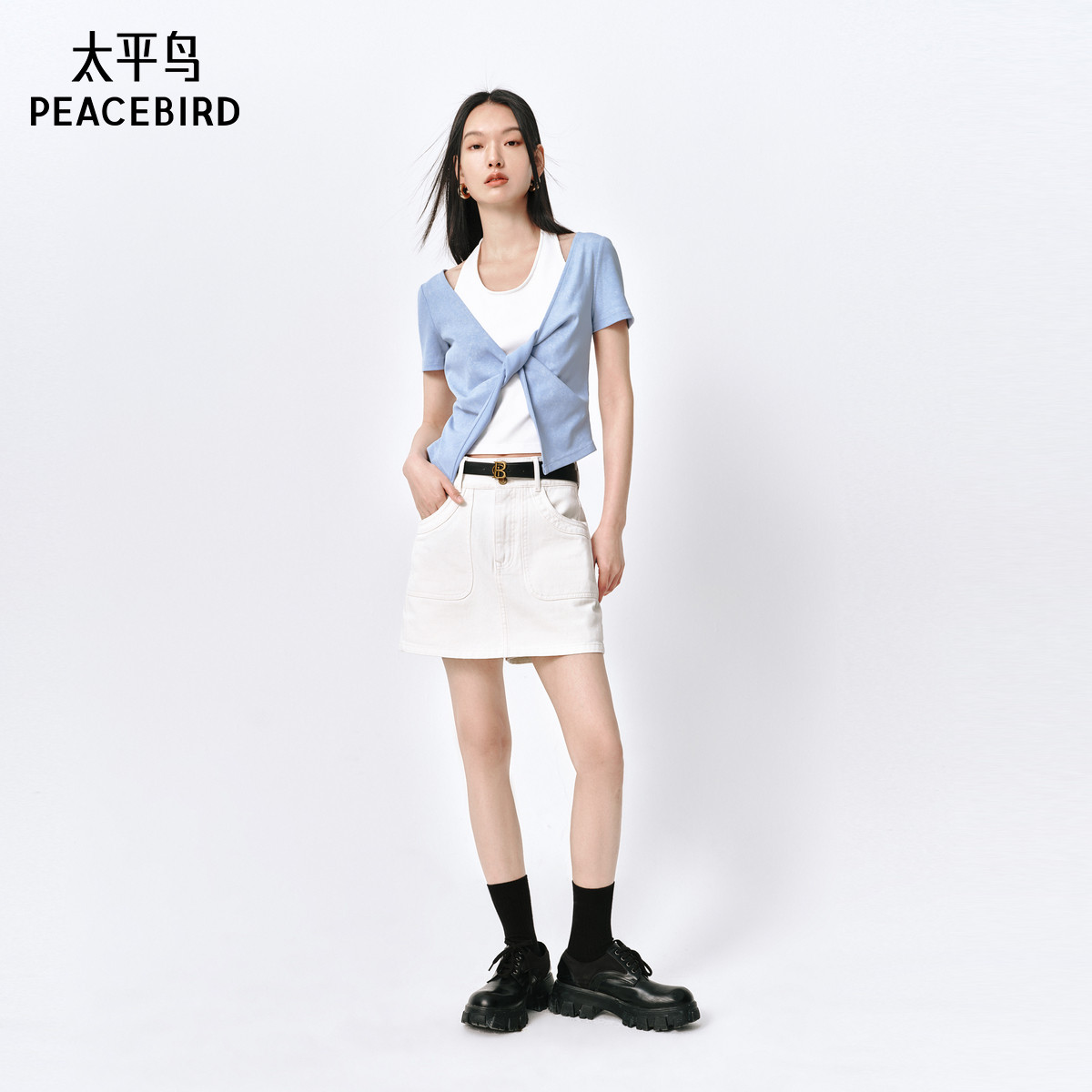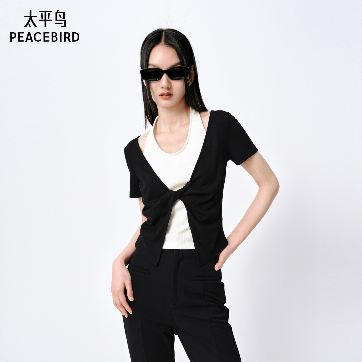 太平鸟假两件扭结T恤女短袖秋新品设计感修身短款针织衫气质