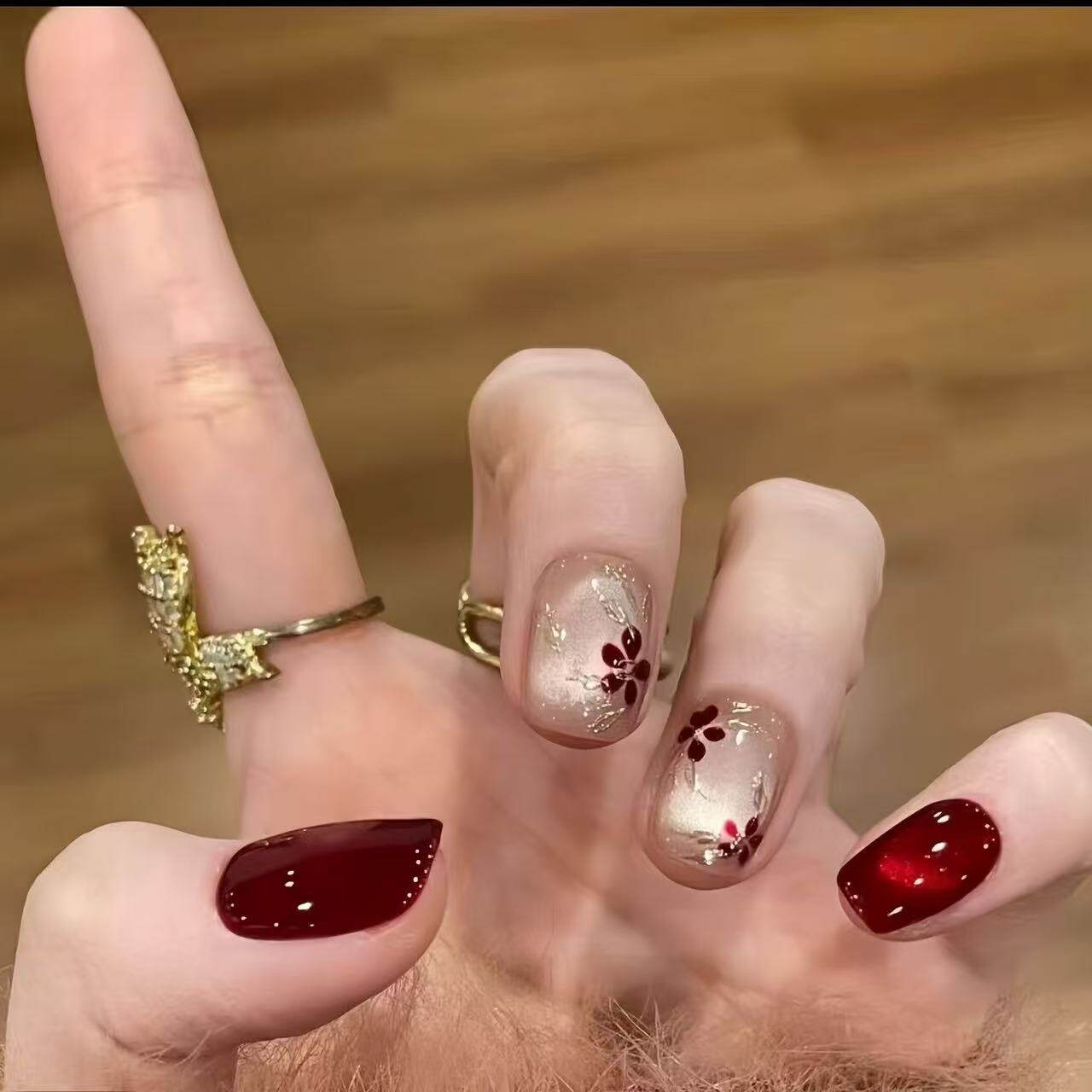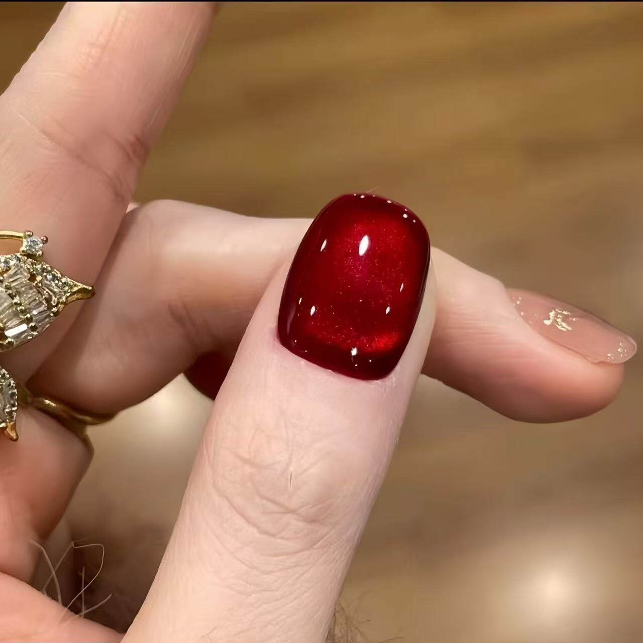 红色猫眼手工穿戴甲短款美甲贴片中长款秋冬法式椭圆带钻新款蝴蝶