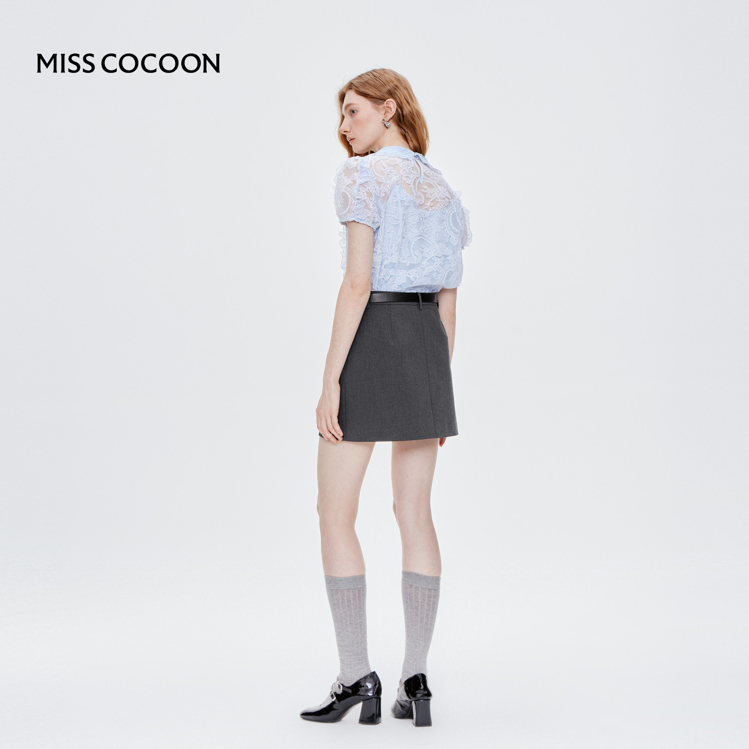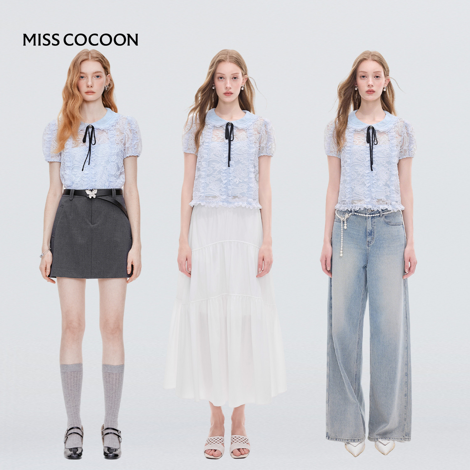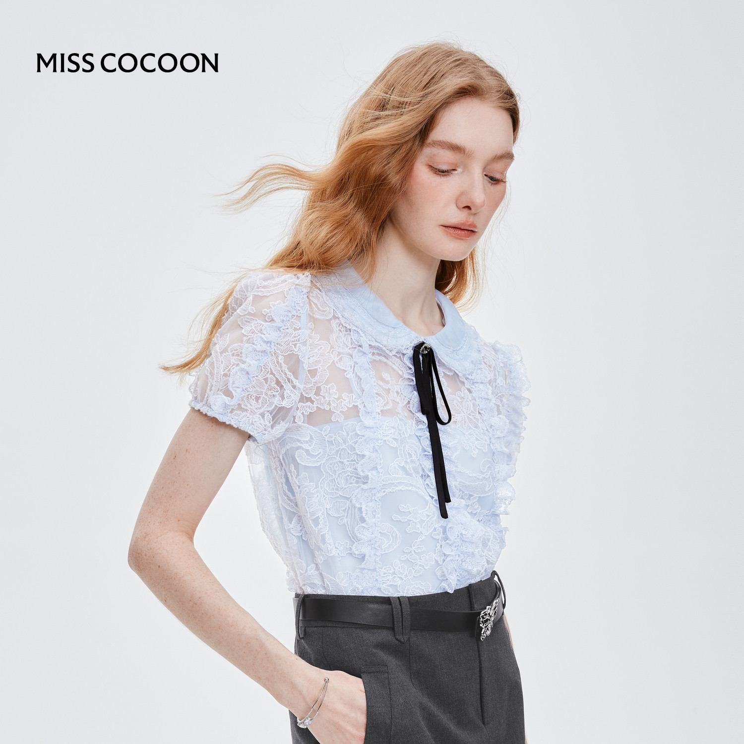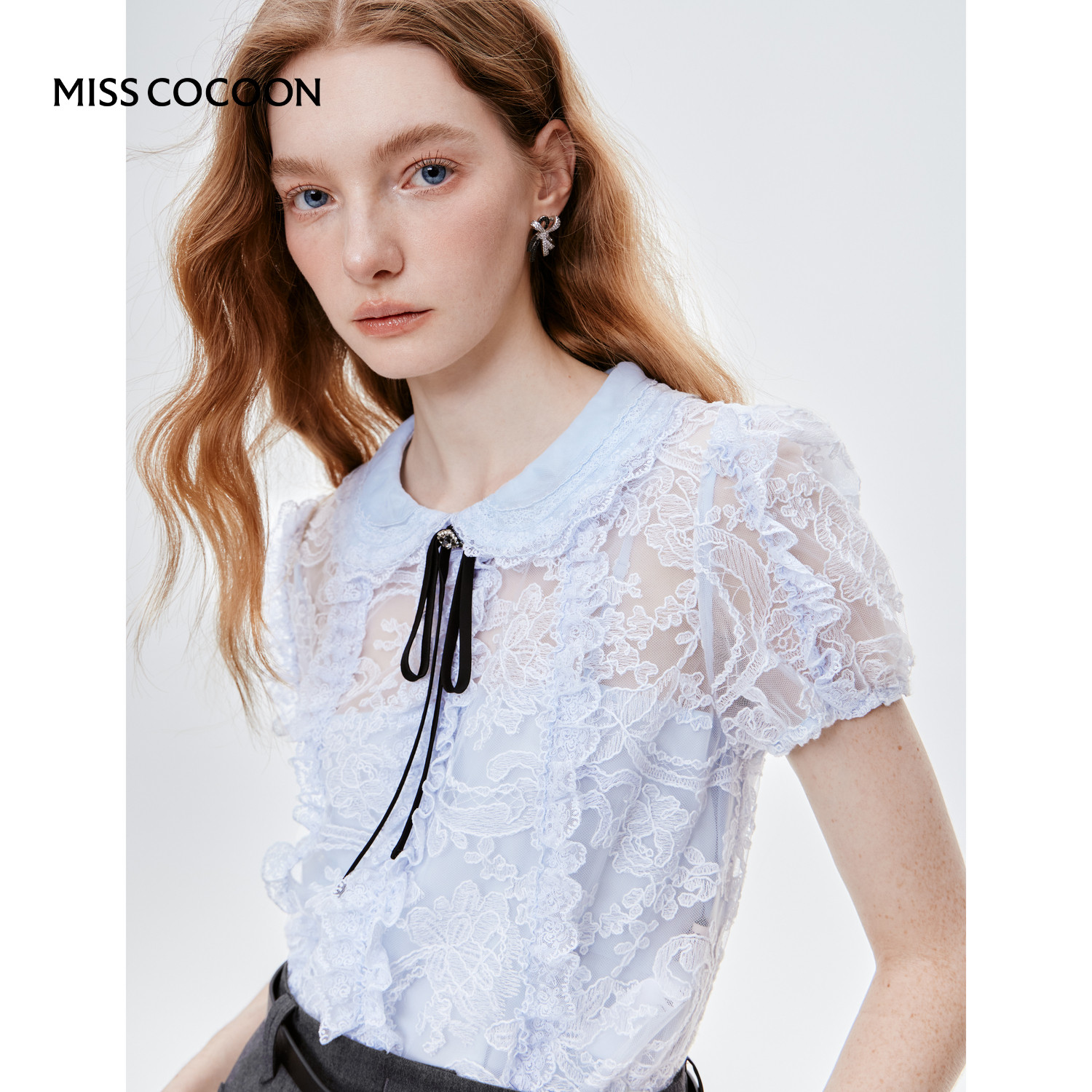 MISS COCOON可可尼泡泡袖娃娃领上衣2025秋季新款蓝色蕾丝短袖女