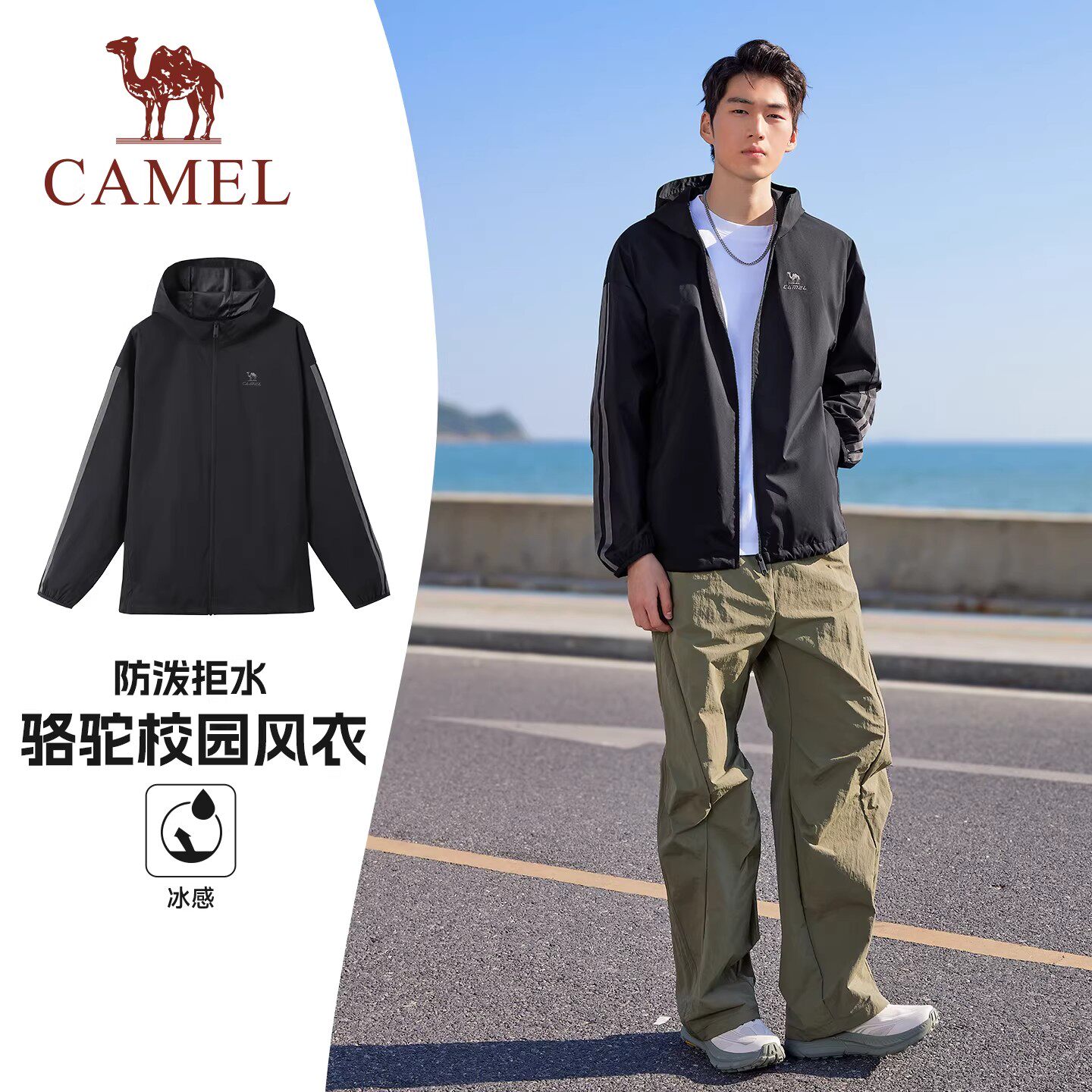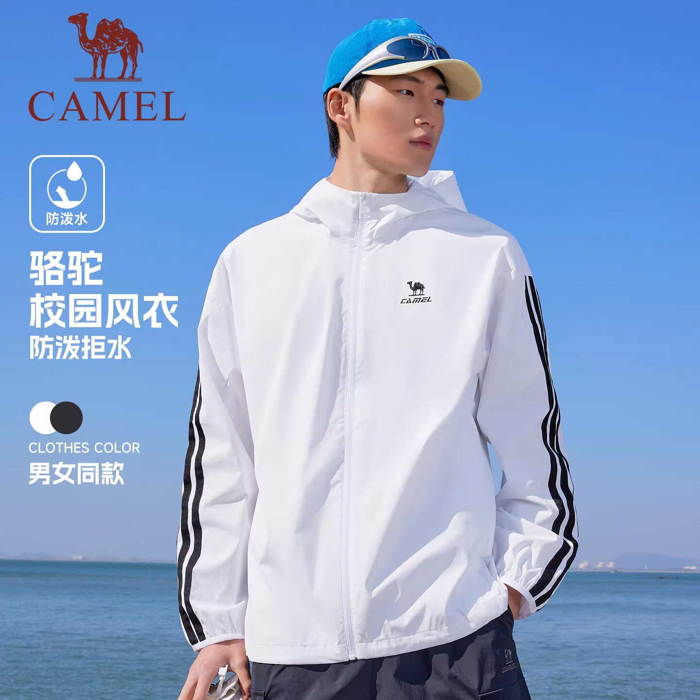 [防泼水]骆驼校园风衣外套男女款复古情侣春夏季运动户外连帽夹克