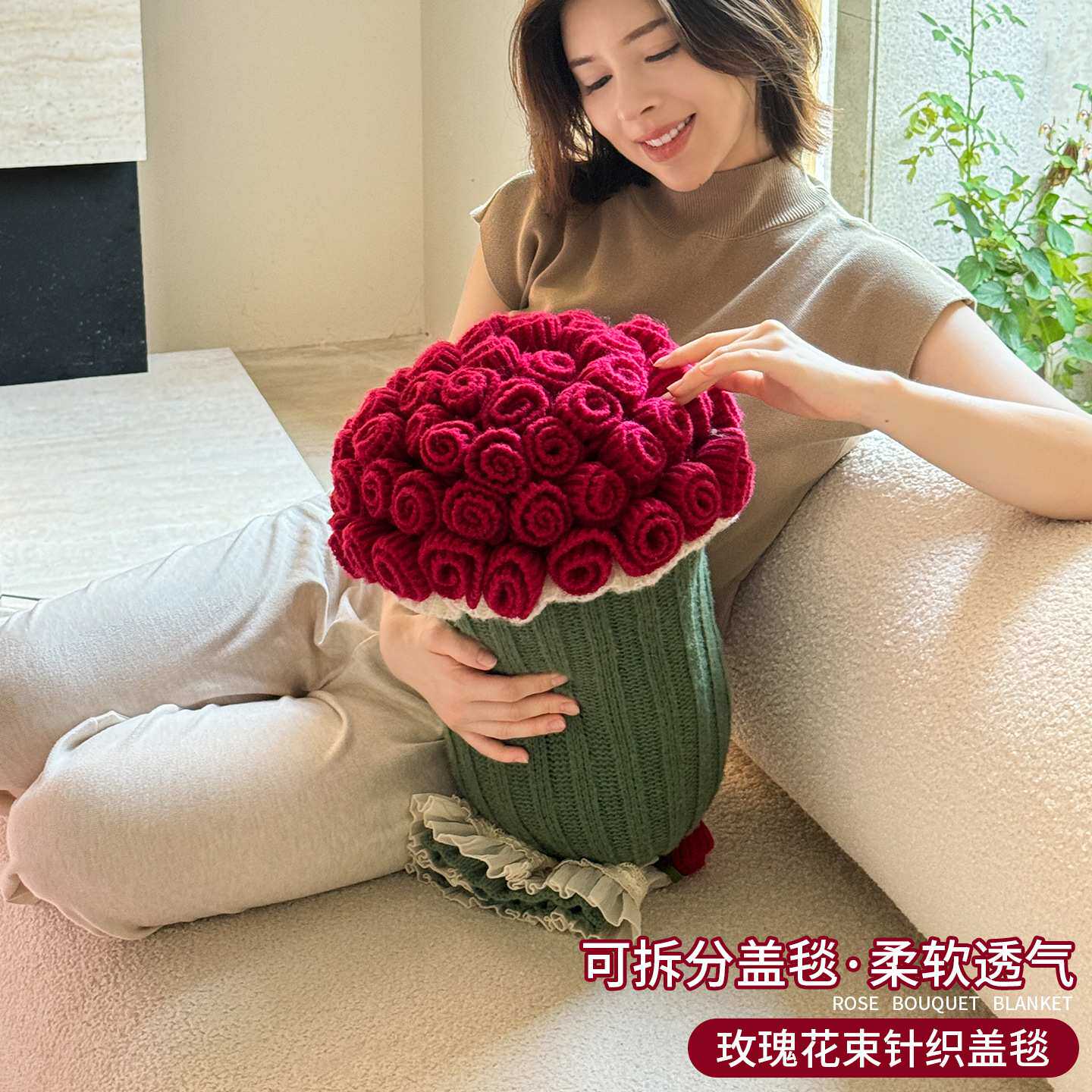 2025新款针织毯玫瑰花束多功能线毯车载办公室盖毯毯子编织毛毯