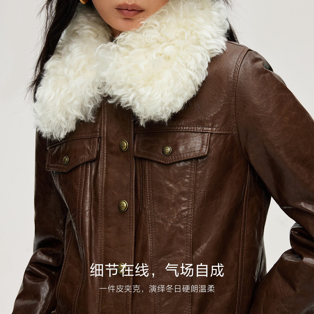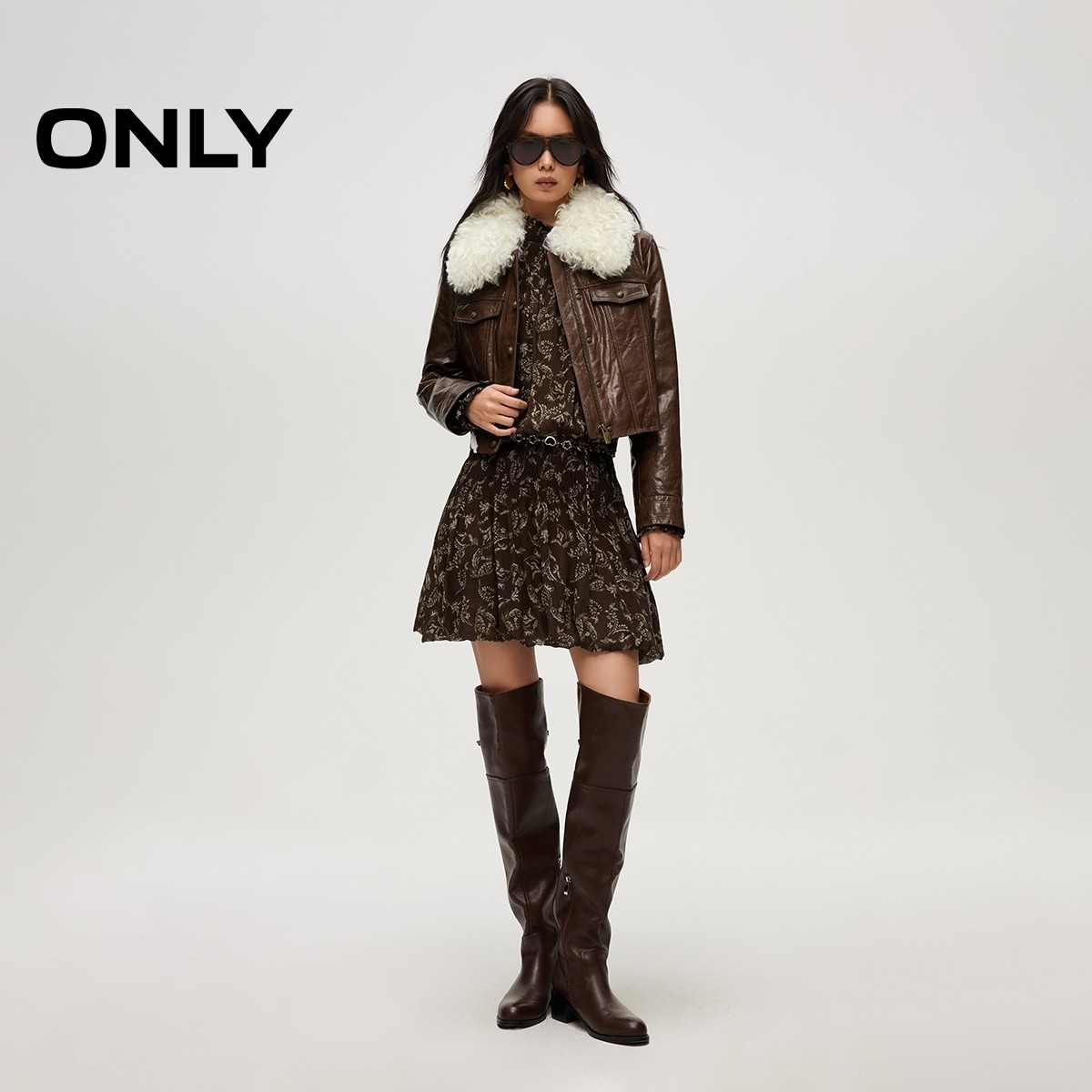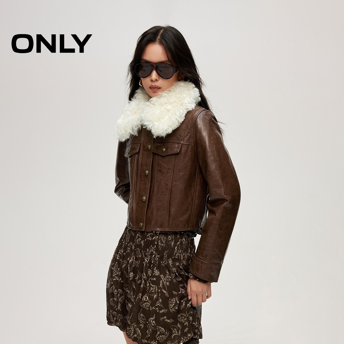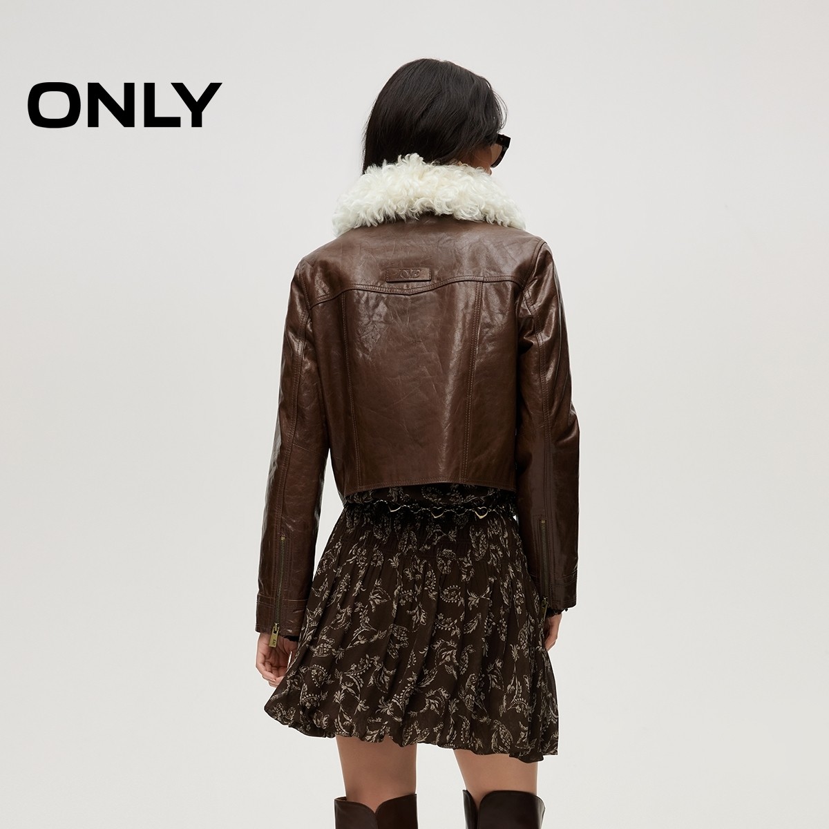 【秀场同款】ONLY2025冬季新款复古摩登羊皮可拆卸毛领短皮衣外套