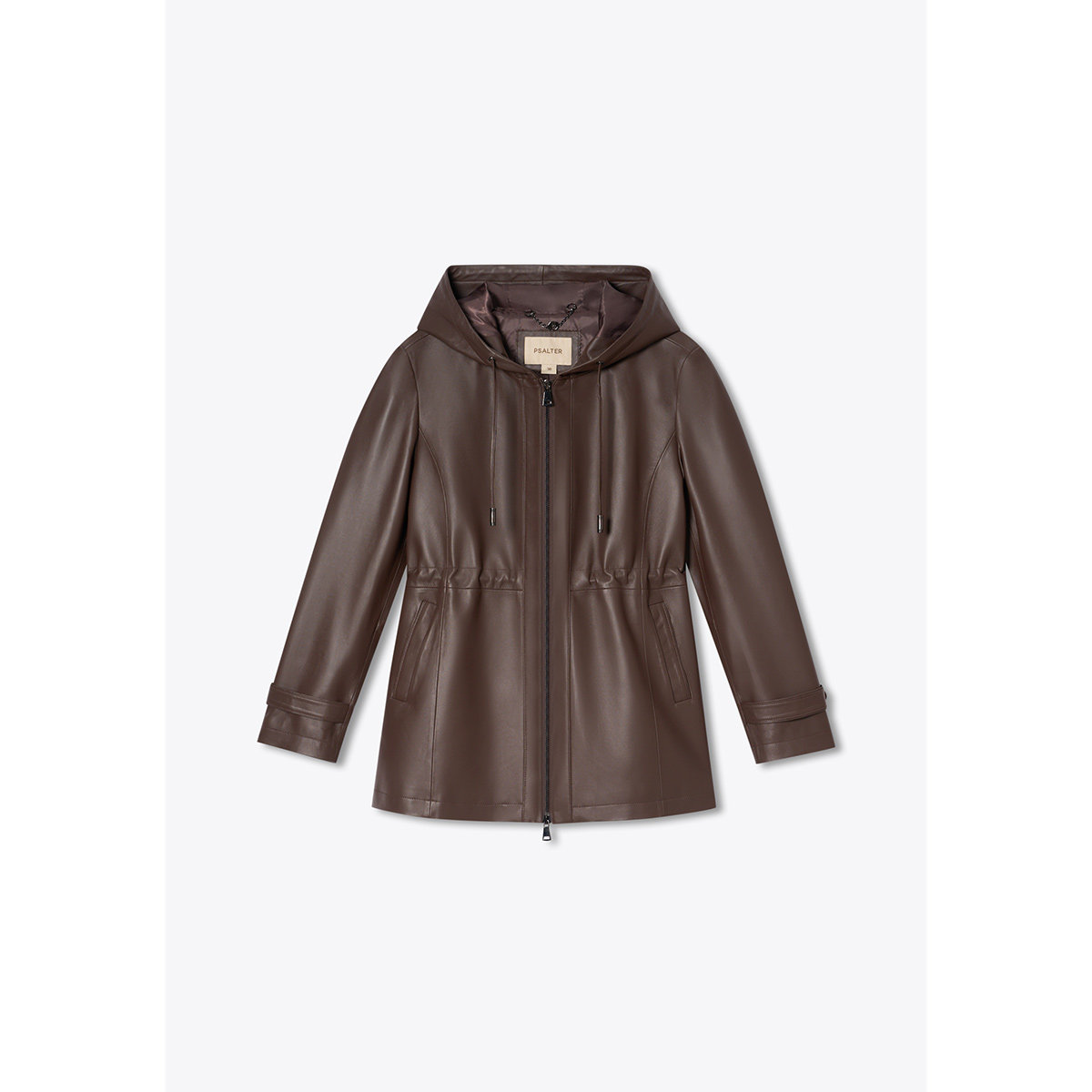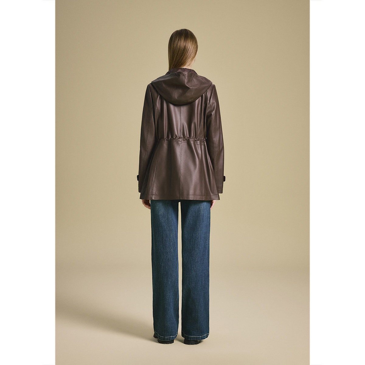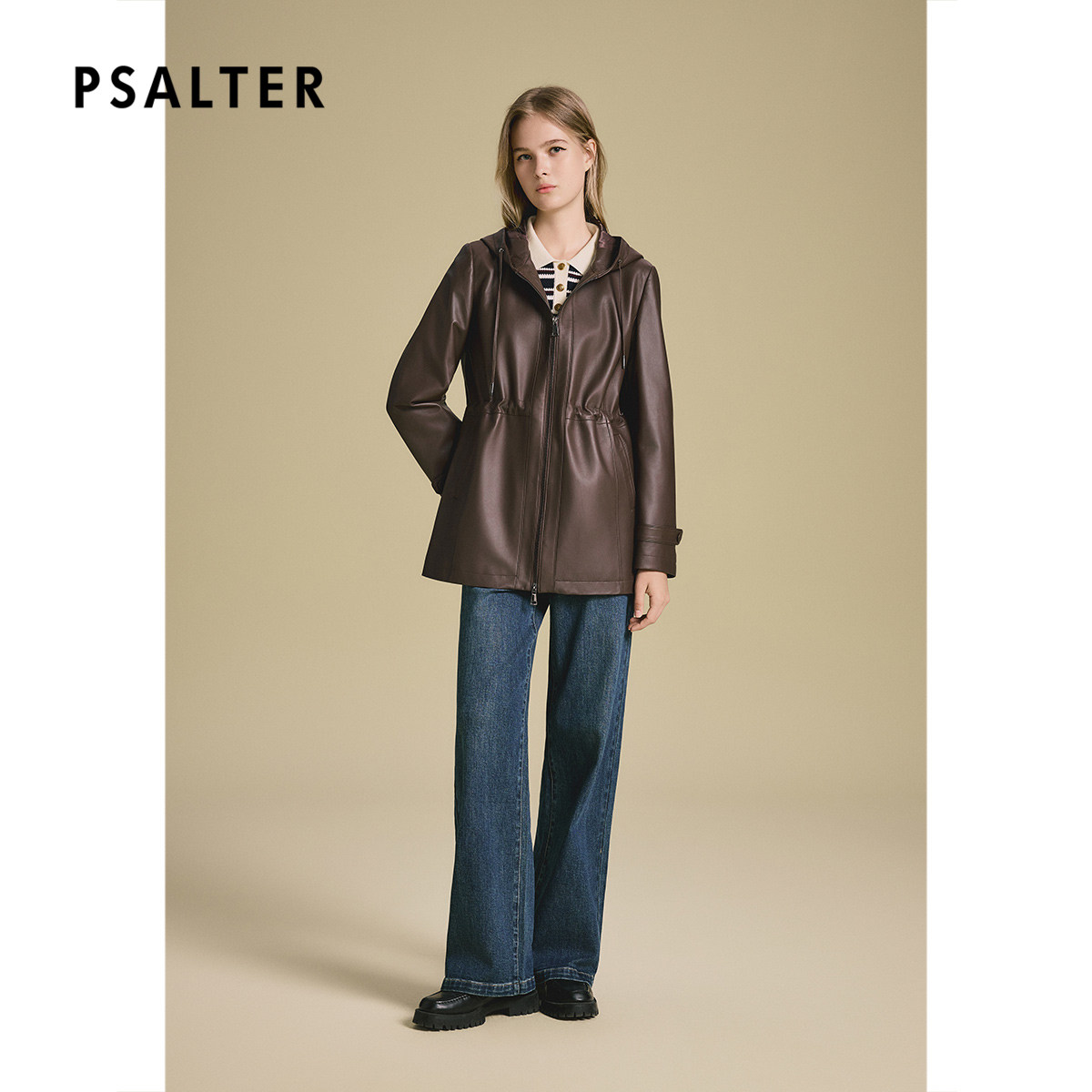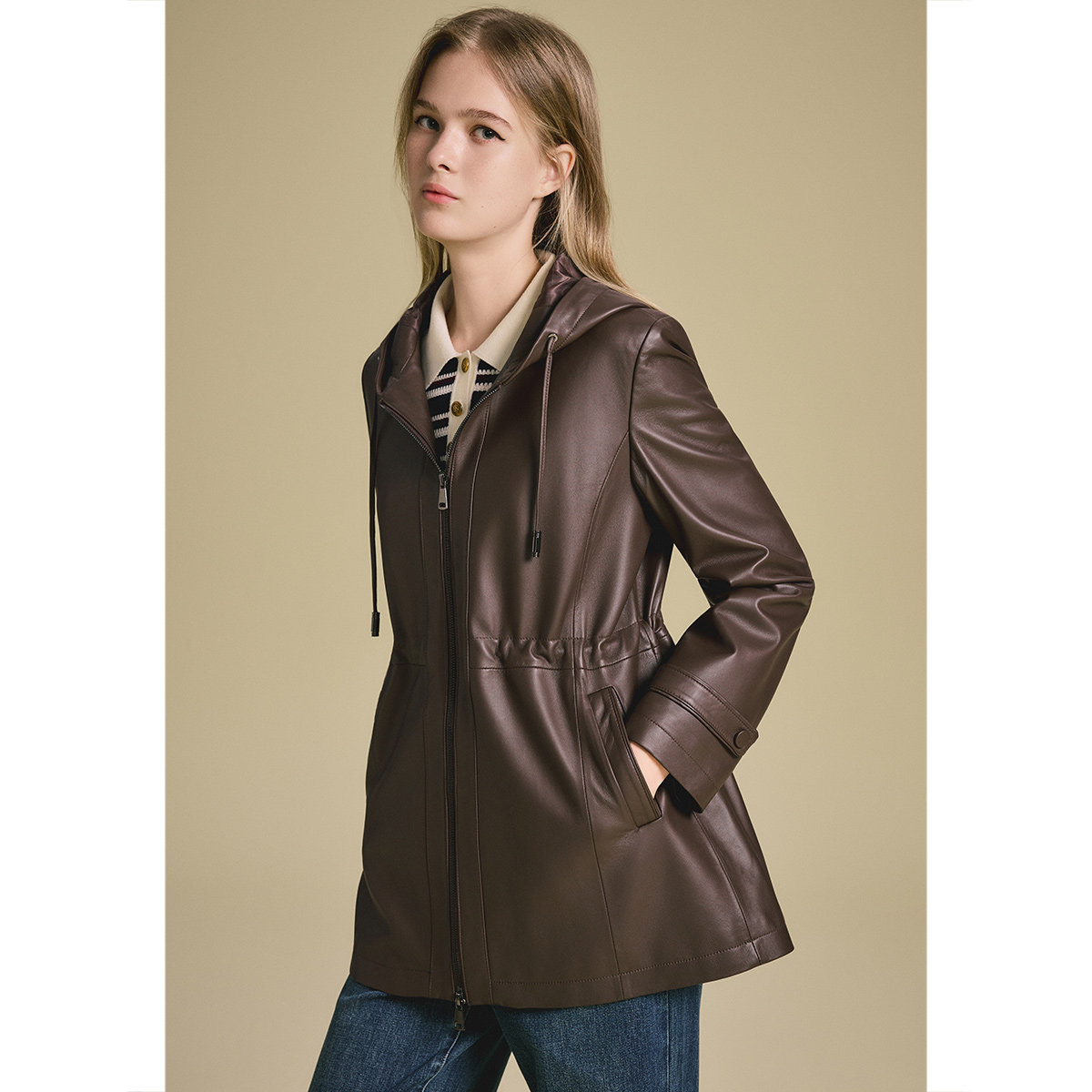 诗篇专选复古咖啡色抽绳收腰双头拉链皮衣外套2025冬季款